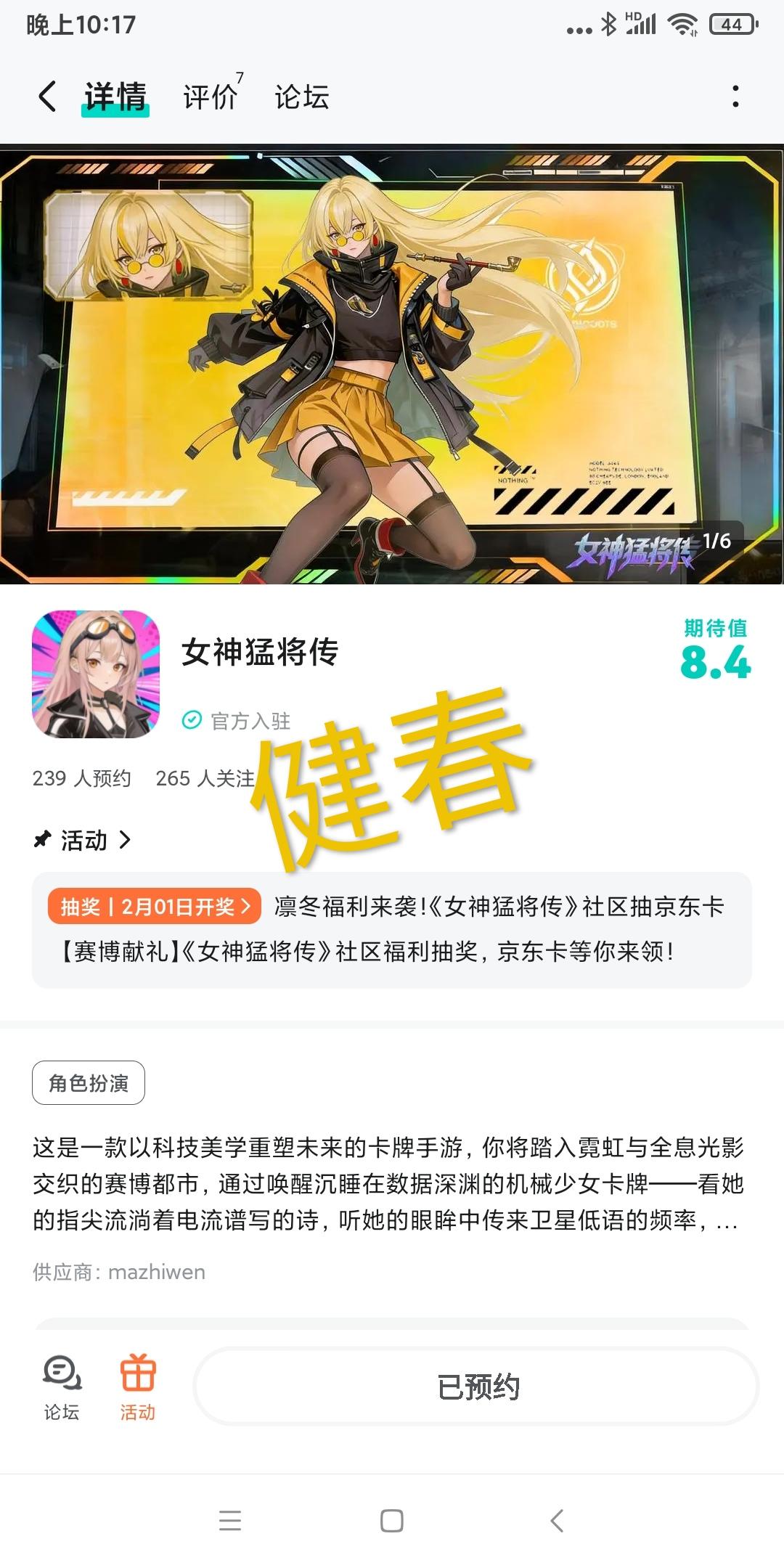 霓虹闪烁,数据奔流,属于机械少女的赛博史诗正待开启!为感谢各位指挥官的关注与支持,《女神猛将传》TapTap 社区专属抽奖活动正式开启,参与即有机会赢取京东卡福利,快来邂逅你的专属机械少女吧!🎁 活动奖励抽取 1 位幸运指挥官,赠送京东卡一张📝 参与方式点击关注本发帖账号及关注游戏在本帖下方评论区任意留言,即可成功参与🔔 奖品发放说明到达开奖时间后,将由 TapTap 系统从符合条件