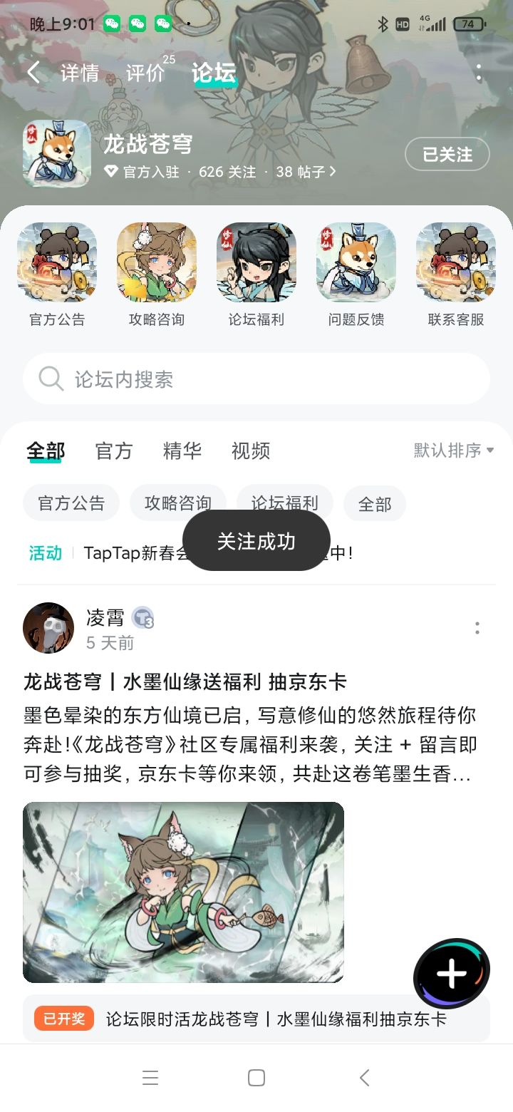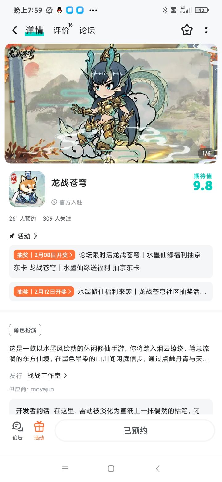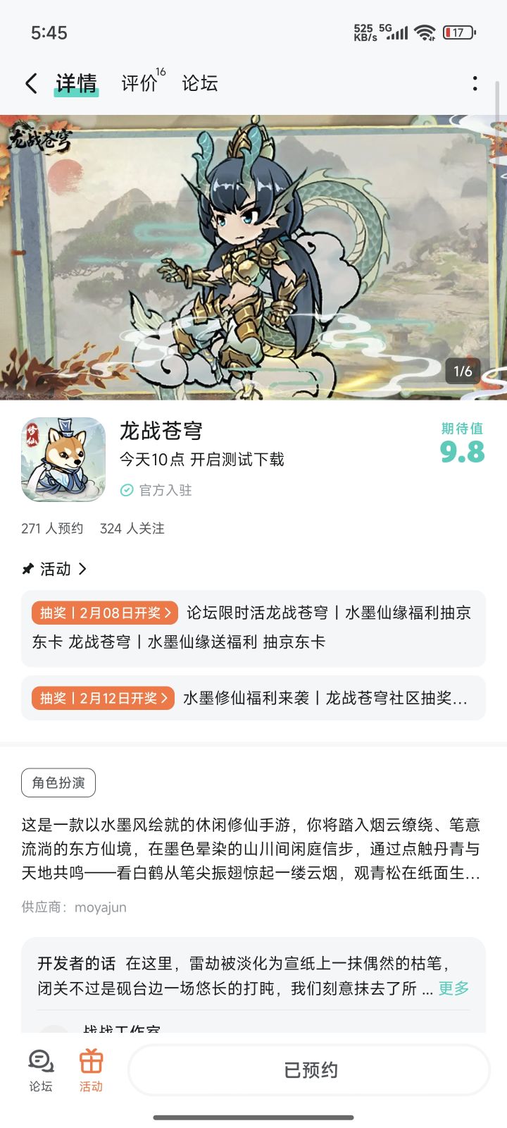 烟云缭绕,笔意流淌,踏入这方水墨仙境,闲庭信步悟大道,执笔逍遥写仙缘。《龙战苍穹》水墨风休闲修仙手游,邀你共赏丹青仙境,静享自在修仙!为答谢各位仙友支持,社区限时福利活动开启,简单参与,好礼相送~🎁 活动奖励活动结束后抽取 1 位幸运仙友,赠送京东卡 1 张📝参与条件1.点击预约《龙战苍穹》并发新帖晒截图2.在本帖下方评论区分享发帖链接即可⏰奖品发放到达开奖时间后,由taptap