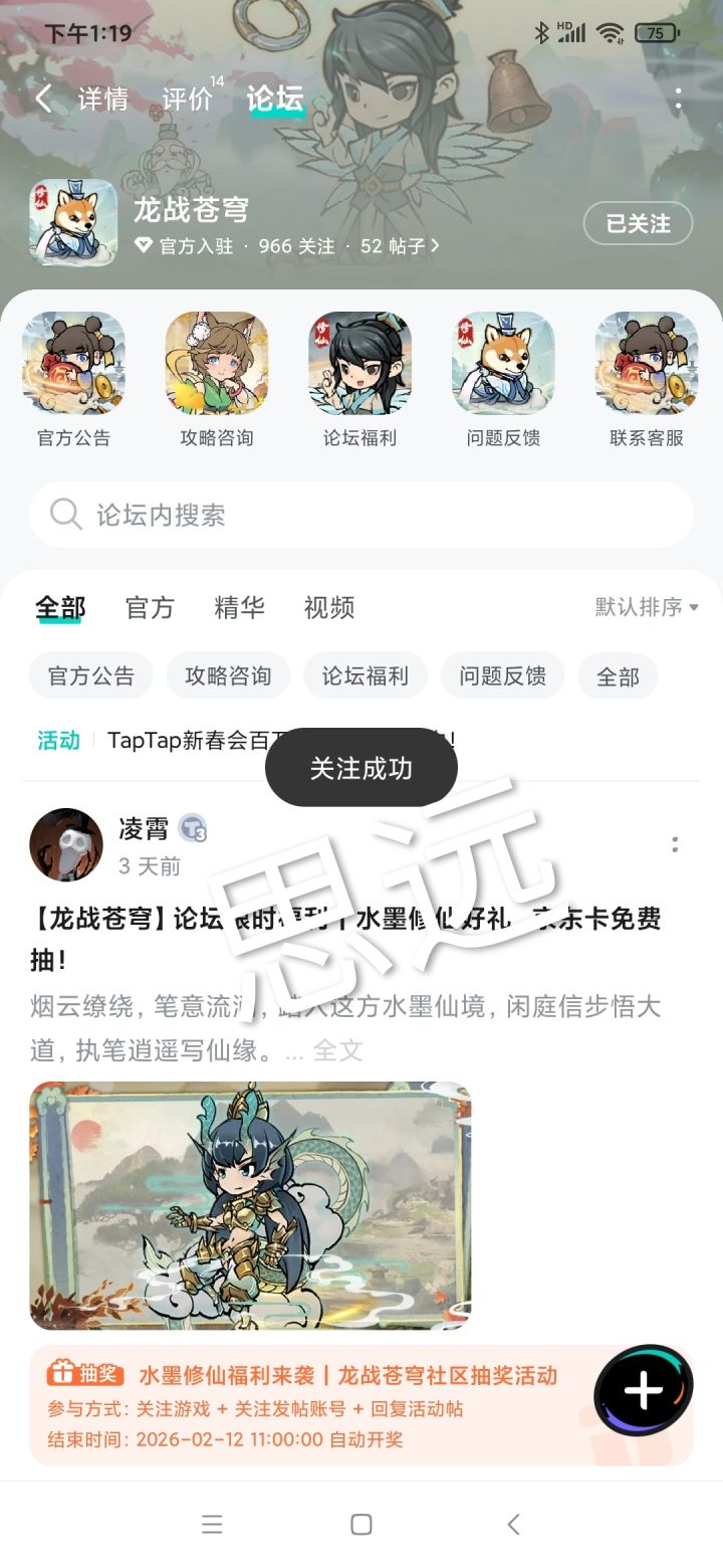 墨色晕染的东方仙境已启,写意修仙的悠然旅程待你奔赴!《龙战苍穹》社区专属福利来袭,关注 + 留言即可参与抽奖,京东卡等你来领,共赴这卷笔墨生香的修仙长轴~🎁 活动奖励抽取1 位幸运玩家,送出京东卡 * 1📌 参与方式点击关注本发帖账号关注游戏在本帖评论区留下你的修仙寄语即可参与📦 奖品发放开奖后由 TapTap 系统随机抽取符合要求的玩家,自动发放京东卡兑换码⚠️ 温馨提示:同一账
