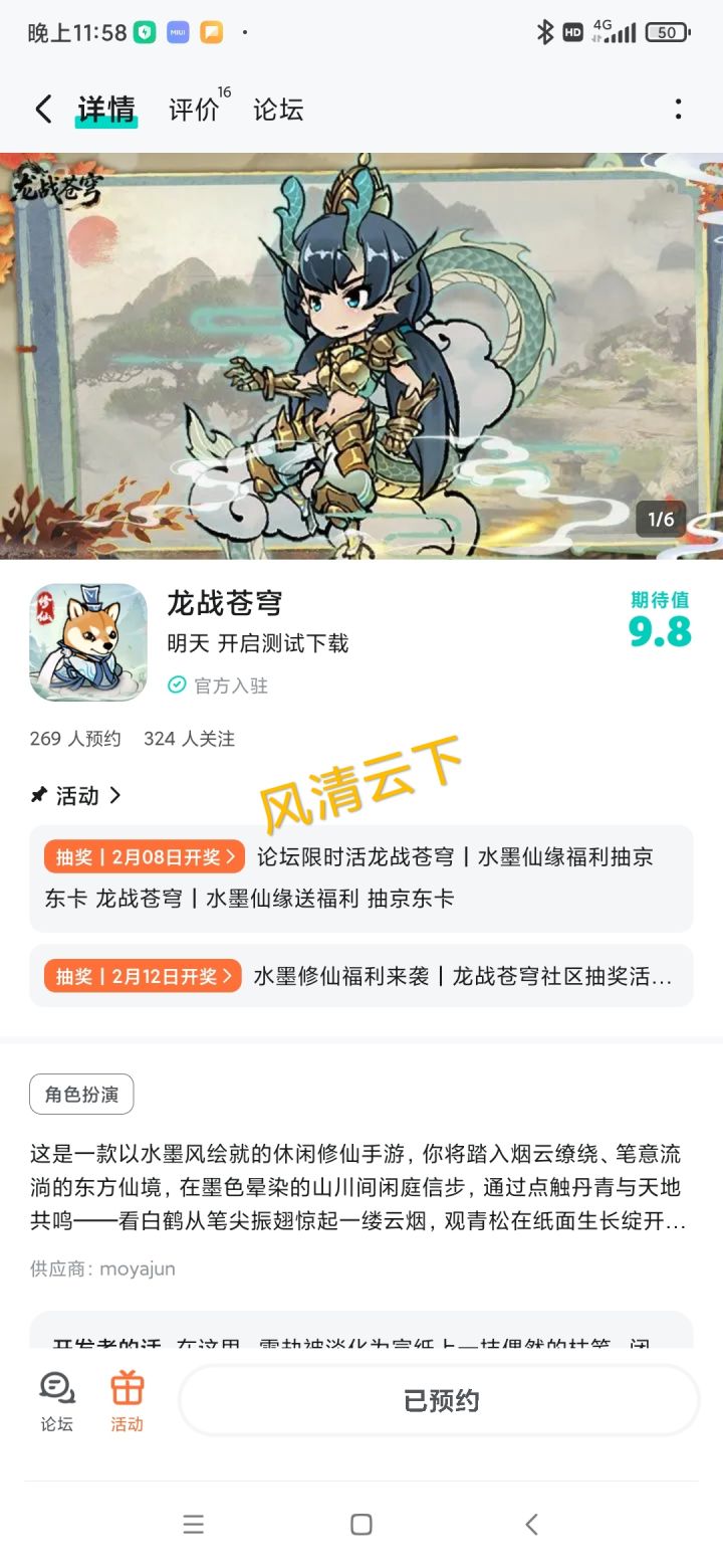 烟云缭绕,笔意流淌,踏入这方水墨仙境,闲庭信步悟大道,执笔逍遥写仙缘。《龙战苍穹》水墨风休闲修仙手游,邀你共赏丹青仙境,静享自在修仙!为答谢各位仙友支持,社区限时福利活动开启,简单参与,好礼相送~🎁 活动奖励活动结束后抽取 1 位幸运仙友,赠送京东卡 1 张📝参与条件1.点击预约《龙战苍穹》并发新帖晒截图2.在本帖下方评论区分享发帖链接即可⏰奖品发放到达开奖时间后,由taptap