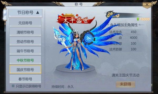 国庆将至,不知道假期各位仙友打算去哪里修仙呐,不要玩疯了哦,记得参加《天生不凡》游戏内国庆活动哦,超多限时活动赢取海量材料、国庆节日珍贵称号、时装、翅膀、坐骑及传世至宝,还不赶紧行动!国庆节专属称号上线 太平盛世闪亮登场全新国庆节日专属称号“太平盛世”已经可以在游戏内看到啦,不知道有没有眼尖的仙友已经在游戏内发现了这个新称号。穿戴后可提升1W5的超高战力哦,不容错过。注:法师和剑客获得称号后增