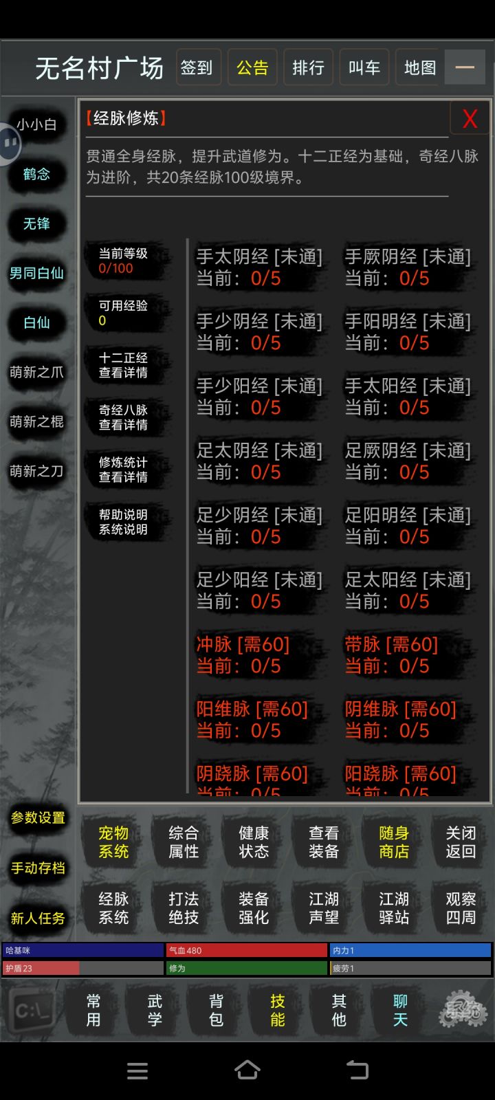 新人在广场领取奖励,拿到技能书后读一下然后冲脉,这里的等级想提升与冲脉有关,冲脉1级可学习的技能上限为10级以此类推,技能书需要打怪掉落,新人建议去王大妈家的坤场打坤,打怪可以掉落炼器材料可以去铁匠铺打造武器装备