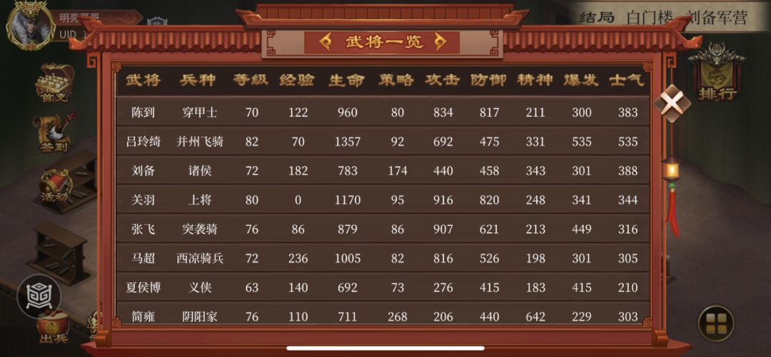 关羽:二爷真是刘备篇的输出爸爸,商城二爷新手皮肤一定要买,杀死敌人后可再次行动,所以搭配的青龙偃月刀、青龙战甲(这两个都是可以白嫖到绿色的),辅助装备根据情况可以带赤兔马,但是敌人多的时候是跑不动的,不如带个+50攻击和50体力的小红马。平民就给2个布阵令提档防御吧,特技青龙斩十字攻击伤害还是挺高的(起码不会让对面反击)。陈到:这个角色也很重要,可以一直用到卧龙篇,刘备、张飞、关羽、孙乾、简雍到了