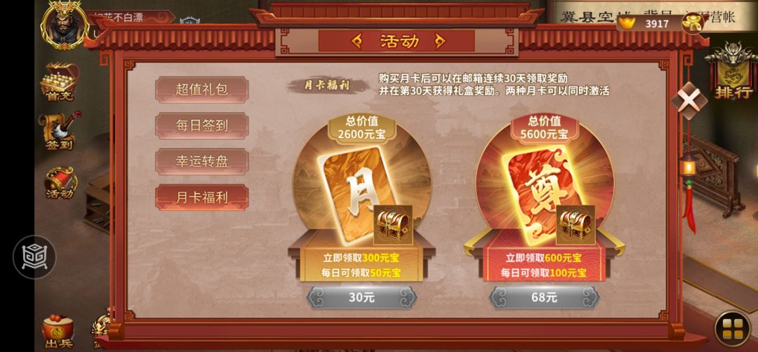对刚入坑的萌新来说入手什么装备最合适, 目前来看性价比最高的莫过于“章武”跟“关羽皮”。地形的改变“平蛮指掌图”优先级变低不少,不过后期到幻想关有富余的元宝一定要入手噢! 月卡攻略:我们粗略的算了一下,一个月你能得多少元宝吧,一个月卡有5400元宝,+每日签到340元宝(不算节假日礼包),共5740元宝,三个月的话那就是17220元宝。 (哇靠你发财了)足足17220元宝!!噢对了氪了月卡还可以