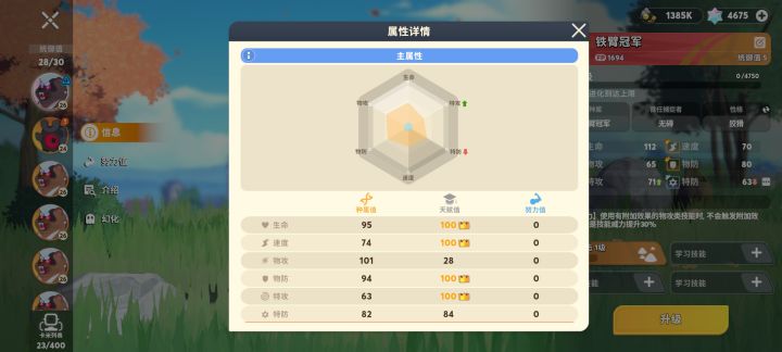 0氪这样感觉已经没什么可以提升的了,就等着慢慢拿资源培养。天赋值很重要,铁臂冠军物攻明明种族值很高,但是一开始抓的天赋值低,30级物攻就69,明显就是逼着玩家重复捕捉。感觉完全体可以自学一个本属性a级技能就好了,可惜a级技能卡限制2次学习,s级限制只能一次学习,a都级抽不到几个,唉