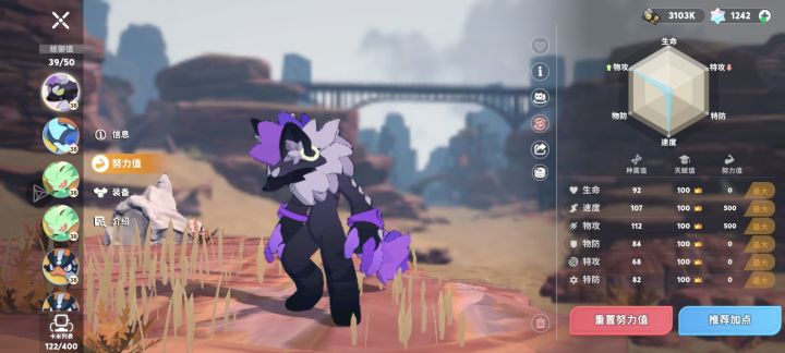 有些人不懂种族值和天赋值究竟有什么用,该带什么技能。如上图所示电狗(也就是图一)物攻种族值112,特攻种族值68,你可以理解为初始我用物理属性的技能伤害为112,特攻属性的技能伤害为68。注意种族值是固定的每个相同的精灵种族值都一样。而后面跟着100的数字则是你自己捕捉的,每次抓到的精灵都不一样随机数是1~100。数字越大相对应的属性则越高。根据电狗(图一)的种族值分布我们优先要保证的就是物攻