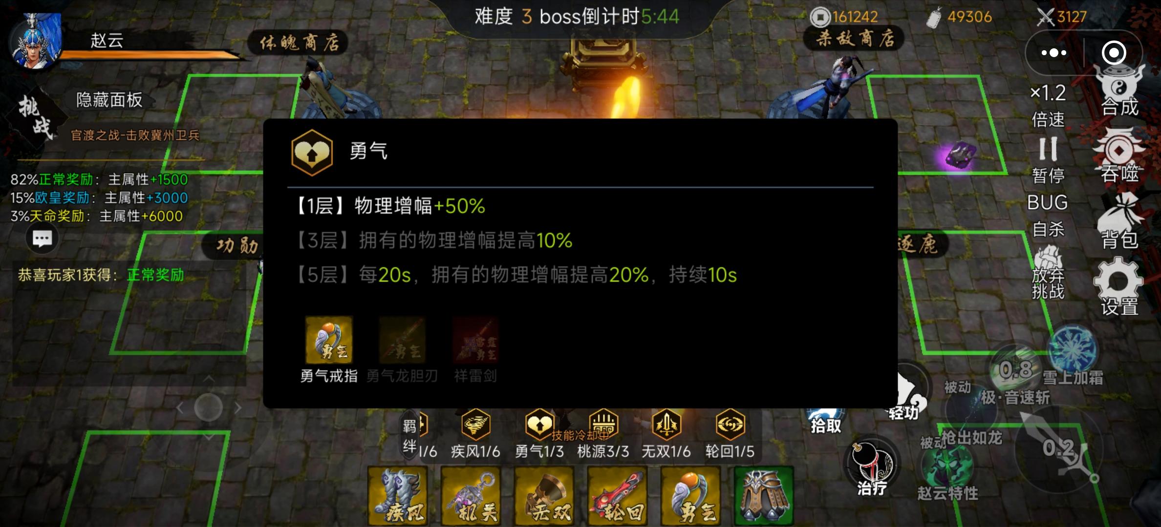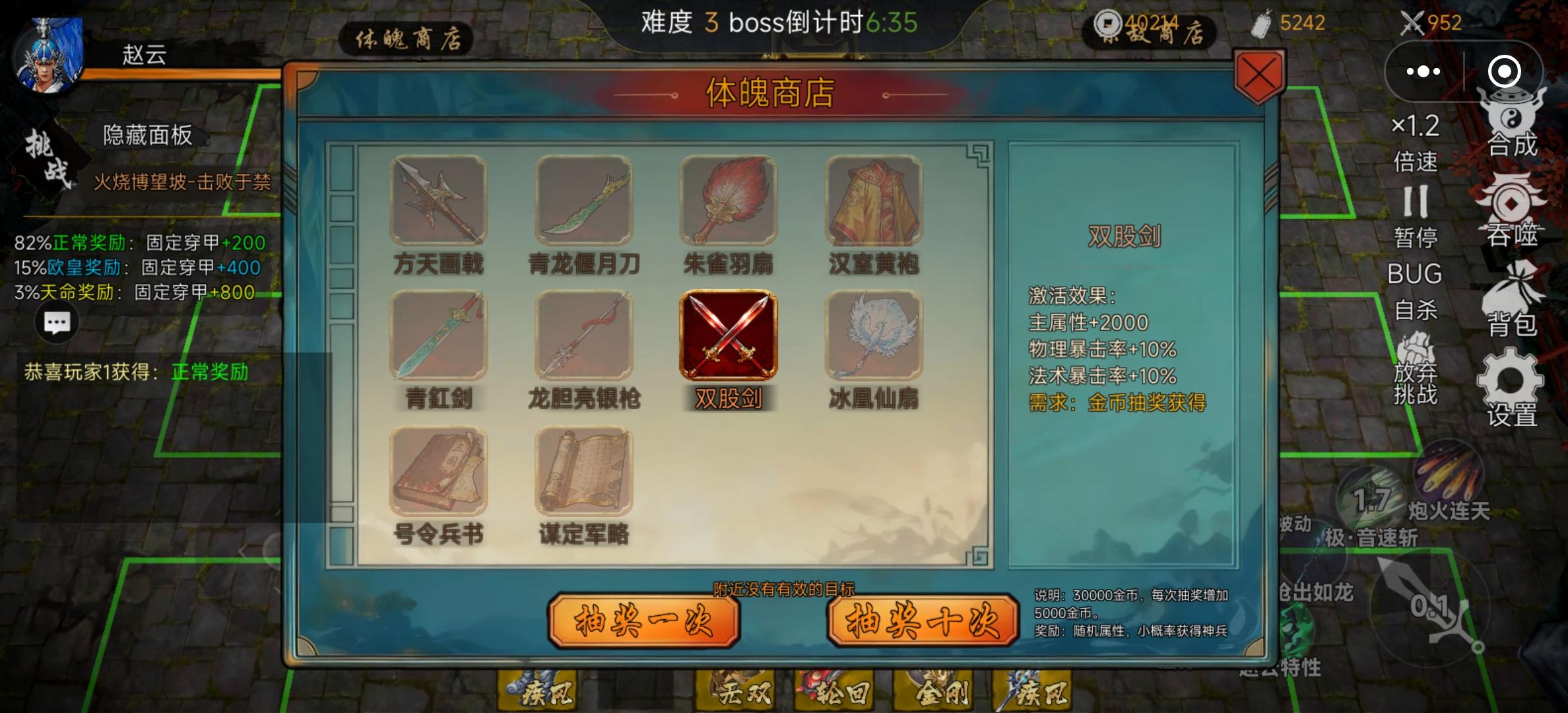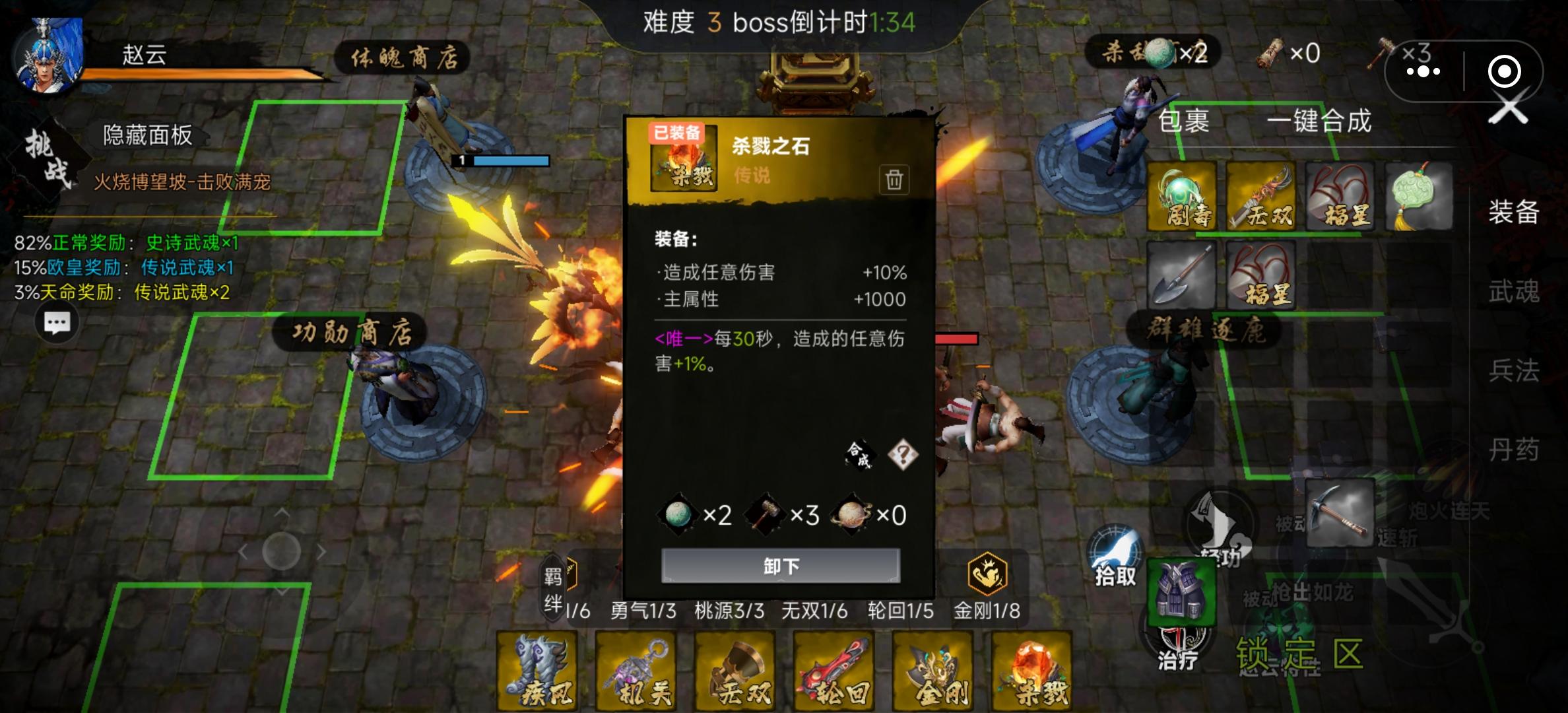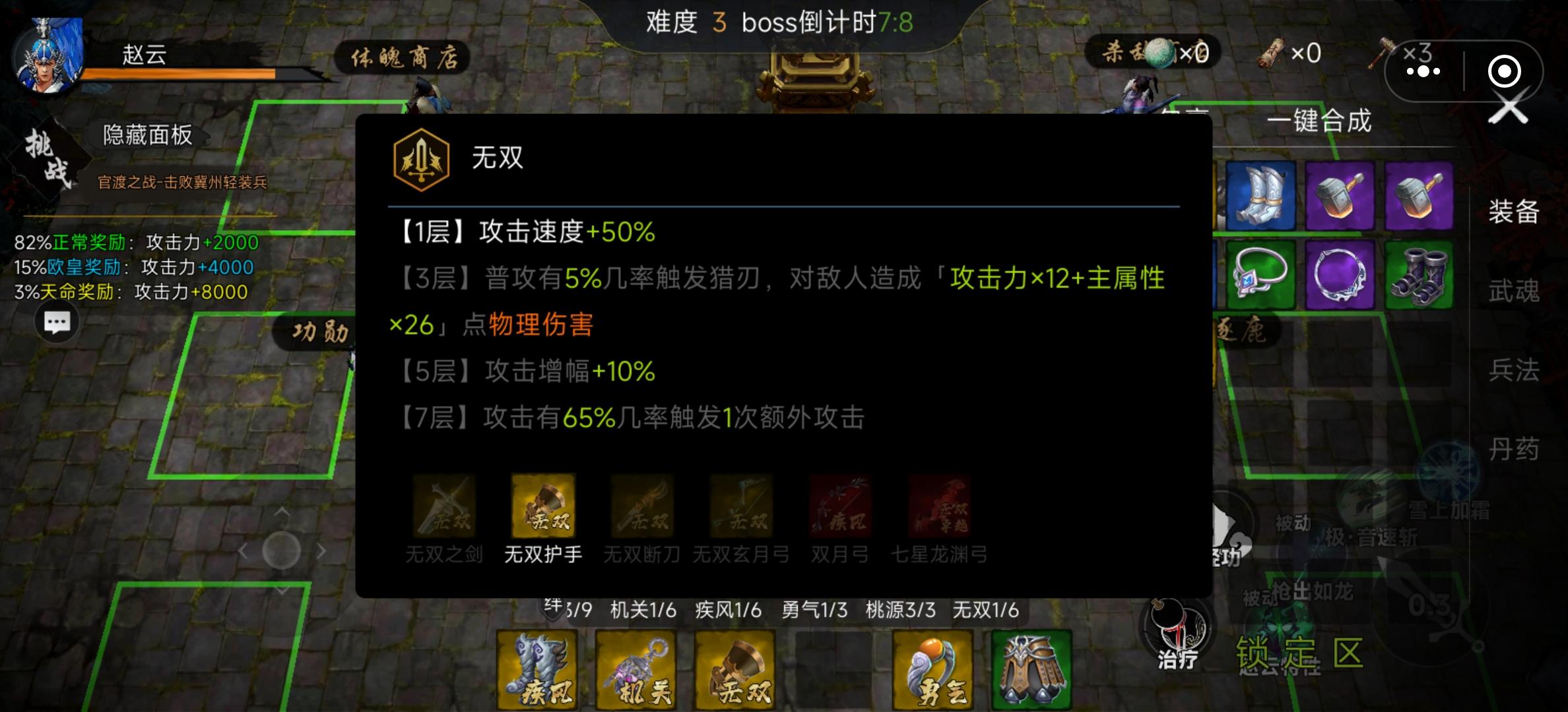 我先来吧 也没啥就是 买一个很重要的能让你选宝物时候变成四选一买了的话会轻松很多 再有别忘了点左上角的挑战 我一开始不知道 就在练功房刷一路推到13关 推不动了 将魂的话我推荐赵云 (所有人我都试过了只有赵云输出最高暴击能打别人打不过的关卡) 然后命格 我也是尽量选的加攻击 羁绊嘛 我推荐狙击 无双 装备紧着加攻速的来