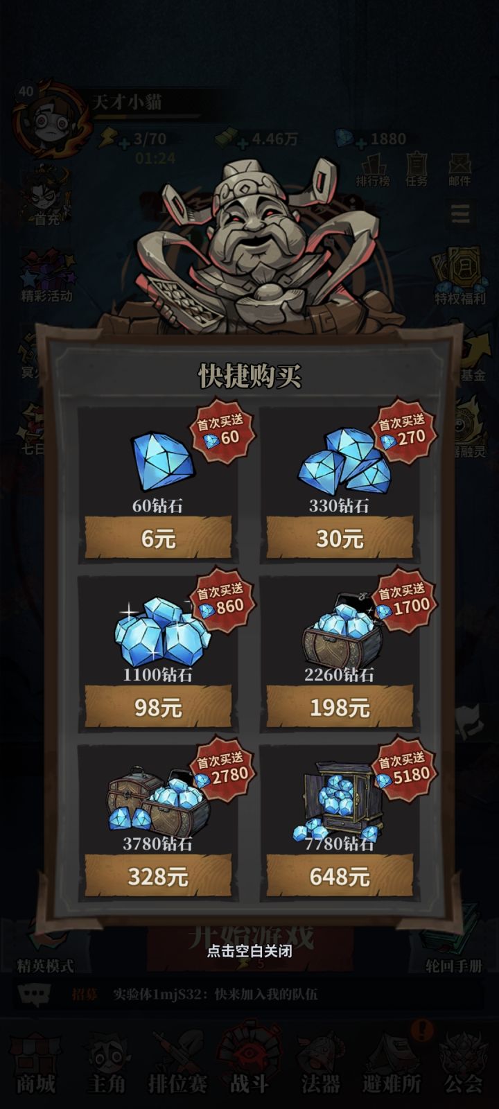 今天第四天感觉玩的还是很开心的,就只氪了个免广告月卡,第一天,能看到一个6元首充礼包,有一个枪械皮肤+5%爆伤,和1个紫色符文子弹+1,然后就是有个法器等级6级出现的30元750碎片礼包,这些都没有啥用直接忽略。第二天,出现了68元首充礼包,开局自带雷符咒,总体来说是有用但不多,我也遇到好几把开局法器摸不到有用的,重开就好了,通关精英5,避难所就解锁了车站,爽蹭招募大厅13把列车。第三天,出