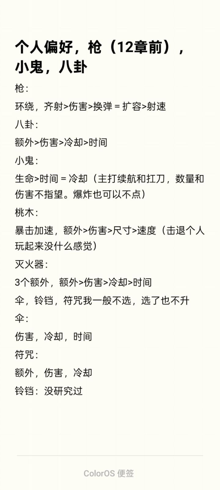 流派选择✨:在前期资源匮乏的时候,我们可以选择枪械环绕流,相比于法宝流来说,枪械流不吃时装的加成,在前期可以给你更好的开荒体验。符文石选择(枪械流)✨:攻击符文 暴击符文 爆伤符文 物理符文 枪械符文 ✨ 齐射符文(紫色开始)穿透符文(橙色开始)连射符文(红色开始)符文前期不用在意品质枪械先用如上符文 符文合成需在身上有一套能使用的符文时再进行合成💎的使用(枪械流)✨:章节礼包中的冰晶
