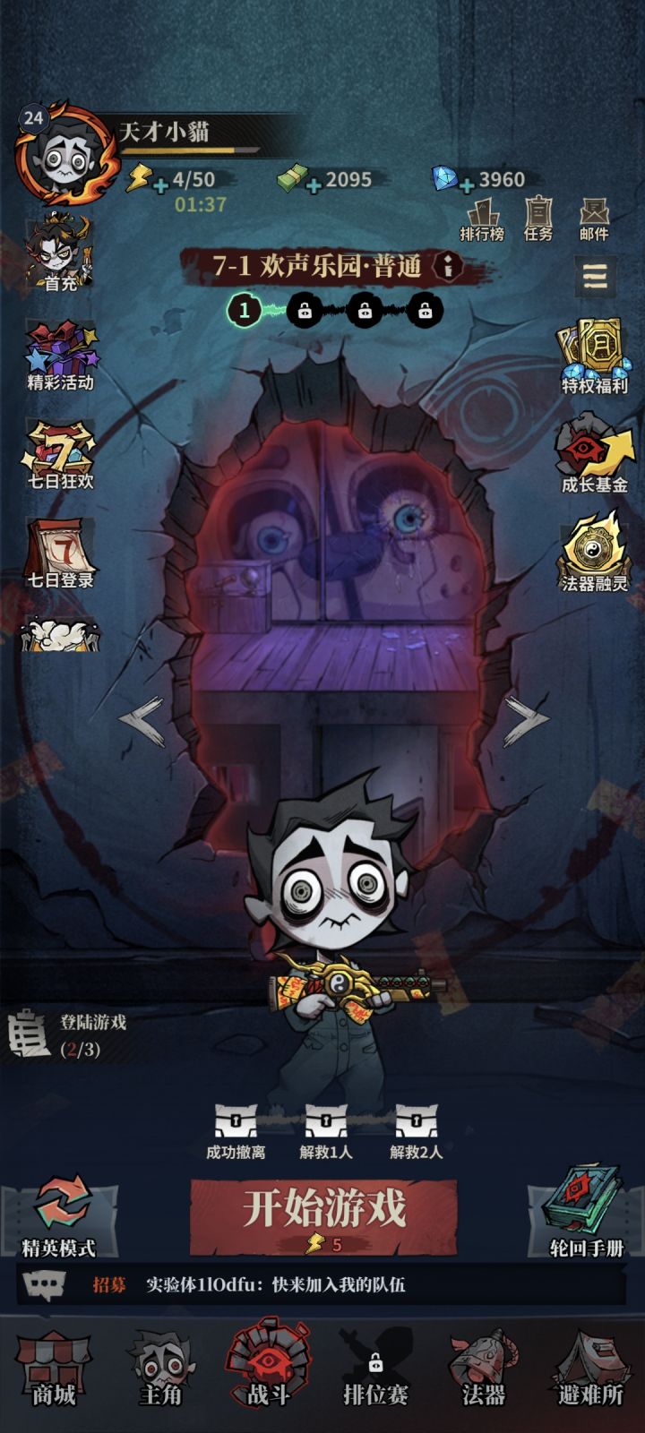 今天第四天感觉玩的还是很开心的,就只氪了个免广告月卡,第一天,能看到一个6元首充礼包,有一个枪械皮肤+5%爆伤,和1个紫色符文子弹+1,然后就是有个法器等级6级出现的30元750碎片礼包,这些都没有啥用直接忽略。第二天,出现了68元首充礼包,开局自带雷符咒,总体来说是有用但不多,我也遇到好几把开局法器摸不到有用的,重开就好了,通关精英5,避难所就解锁了车站,爽蹭招募大厅13把列车。第三天,出