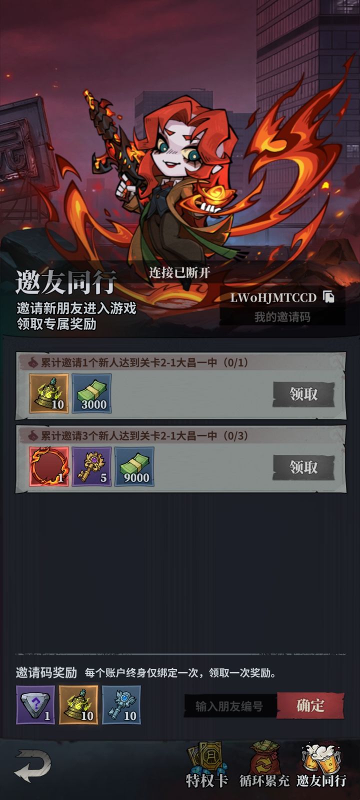 5级输入同行礼包码 : Lsj2rxVyik入口:右上角“特权福利” -右下角“邀友同行” 兑换码合集,试过了,目前都能用: Q3M9KJ VTY9WE WD8Y4P 6jtjv7 c97s4h JKCC46 wxlh666 wxlh888 ZB9527 XCLB888 XCLB666 vip666 vip888 vip999 ZrDMw4 UD7C3R MU