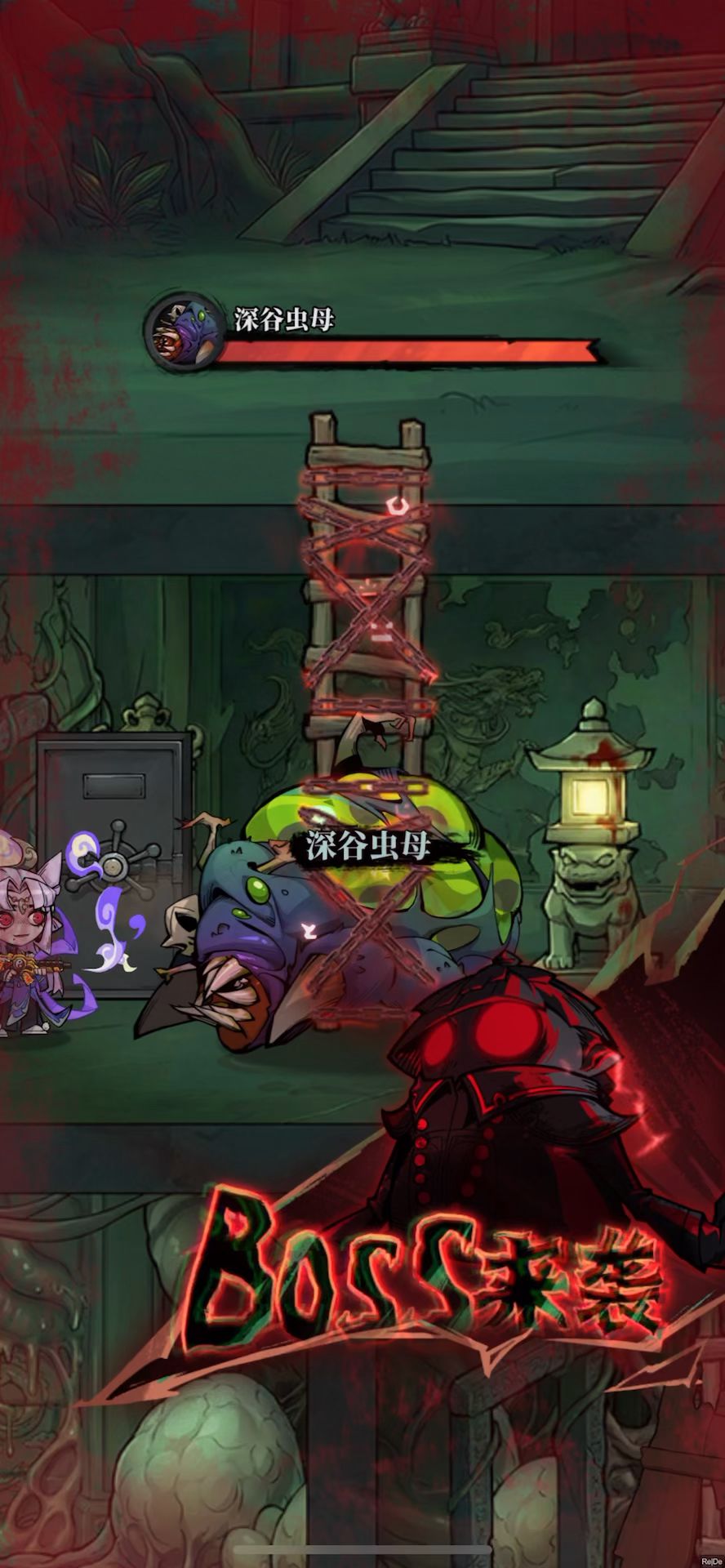虫母一共两种攻击方式 第一种,身体向前冲击一段距离,在我看来就是平A 解法:很简单,不要站在攻击距离内就行 第二种,召唤数只小虫子对玩家发起冲锋 解法:也很简单,堵门打就行,在等待血月来临的时候就可以提前修两道门,基本上强度适中的情况下,虫母攻破两道门的时间足够玩家打死他了 堵门!堵门!堵门! 这个BOSS没什么难度,最初级的堵门战术就足够了