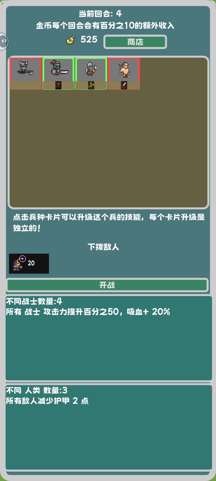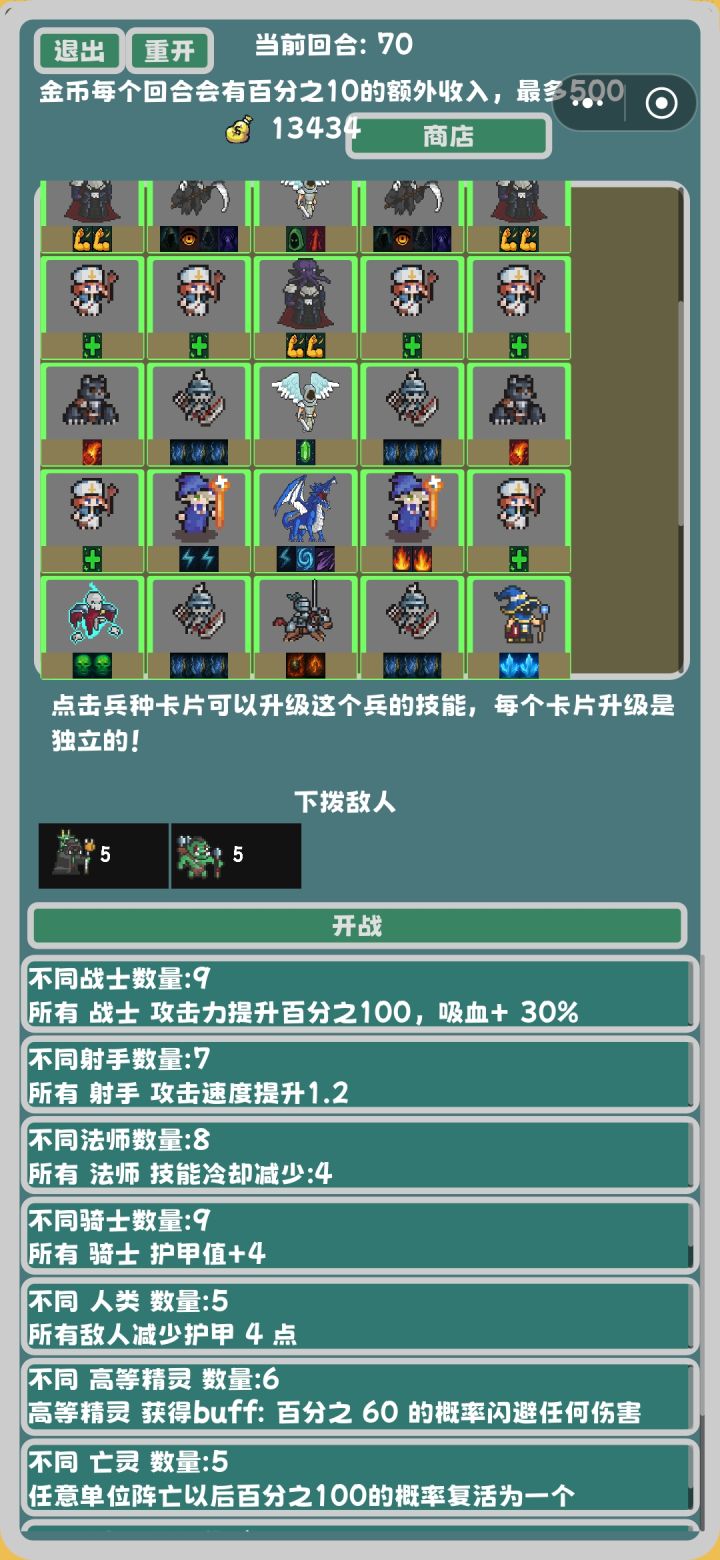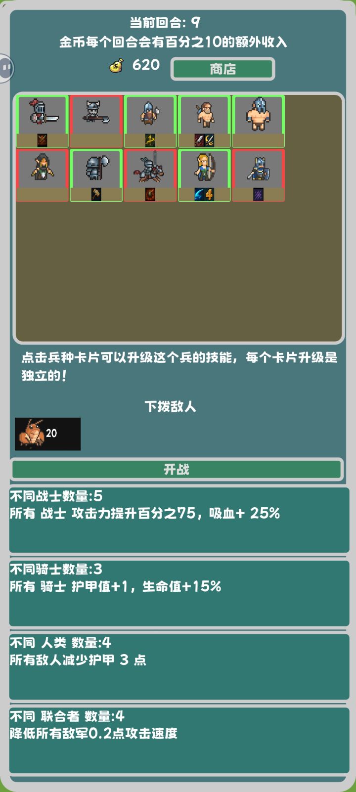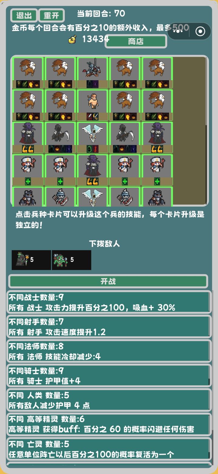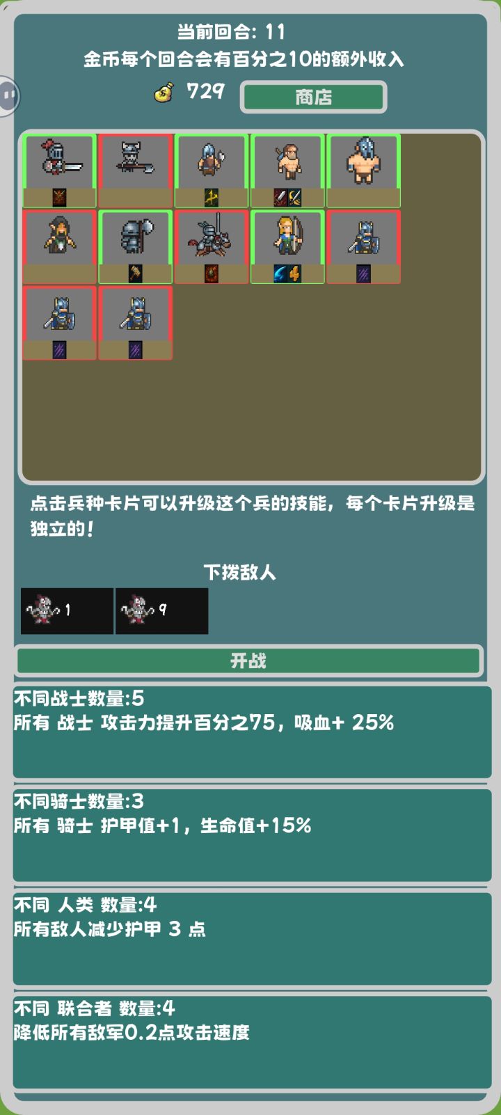 1.这个游戏里面是有隐藏兵种的(这个怎么不告诉我啊?我靠,我玩了一个小时才知道)你拿到某些特定的兵种之后,它就会现隐藏兵种,然后你就可以合成。(没有隐藏兵种无尽你想打过第5回合都难)具体怎么合成可以刷一下论坛,还有好多大佬发了2.这个游戏是可以凑羁绊的,我觉得最好用的羁绊应该就是战士和亡灵了,战士羁绊高功加回血用来打那些特别肉的比较好用然后亡灵羁绊的话是死掉的人有可能会召唤一个小骷髅吧,可以说是