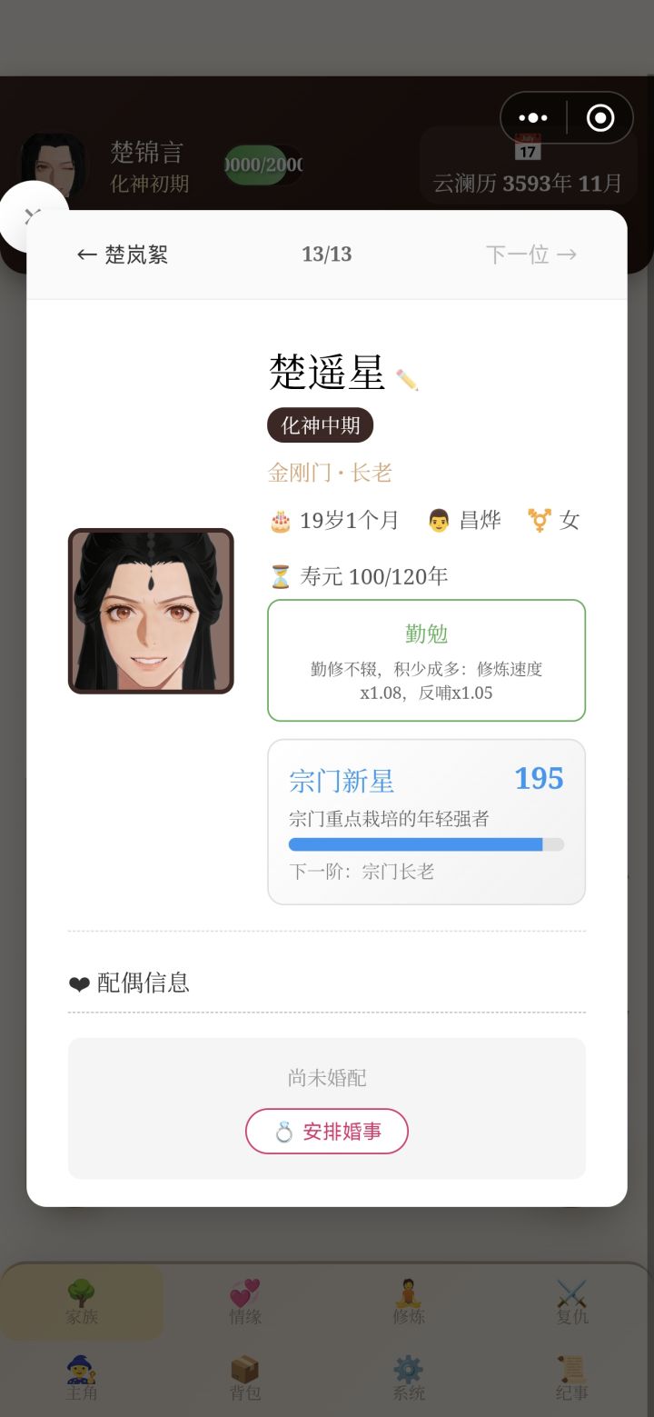 做一条小小的攻略,给刚玩不知道头绪的新手❶情缘不着急在游历中结识,有一两个够用就行,先把修为提上来一点,集市买一点止血草,去秘境刷救人【如P1】,此方法刷的情缘质量很高,目前没有刷到过资质在90以下的【如P2】练气期也适用哦~就是悟性普遍较低,颜值不定,可以反复刷,择优录取注❗这些情缘部分寿命很少,有些甚至下一个月就会死,注意观察一下【如P3】。真喜欢,就在当月疯狂双修提升突破