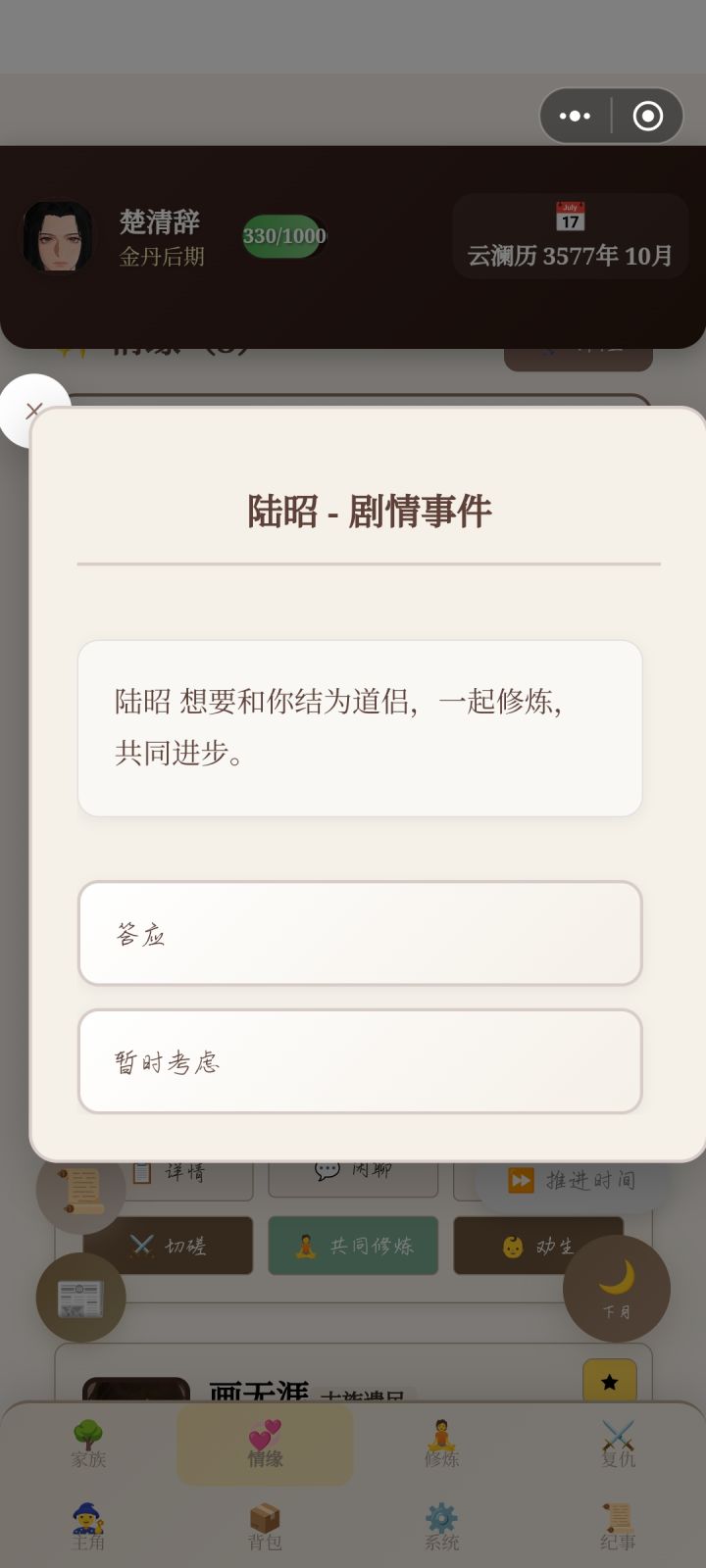 已经是道侣了,但是突然又提出成为道侣。17岁就结的,20了突然又提出结道侣