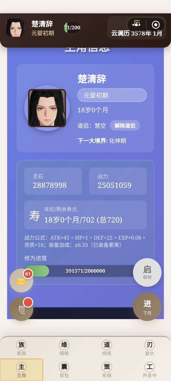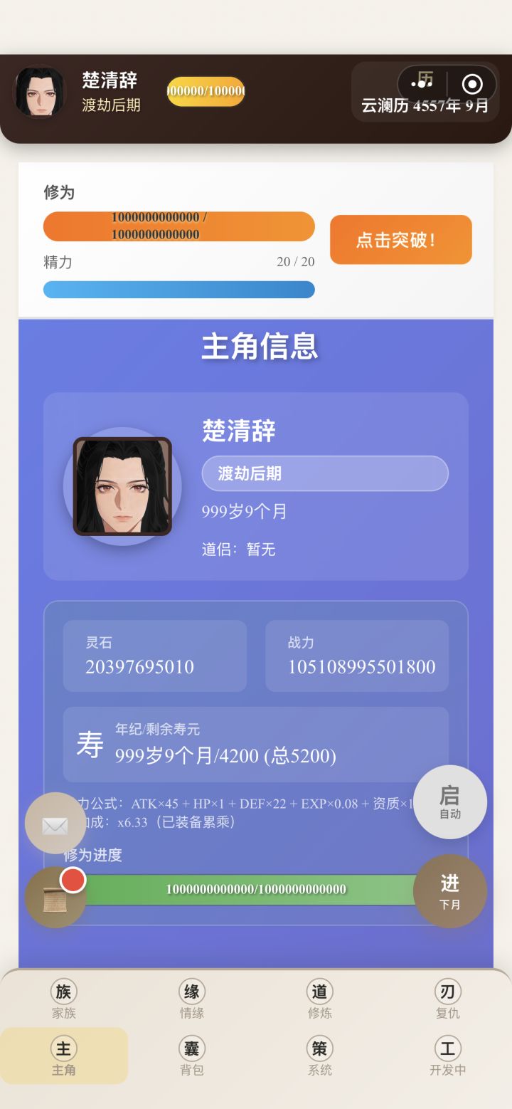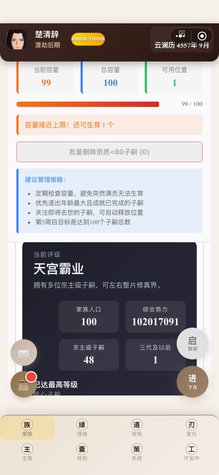 前期都让主角自己刷副本修炼,到化神期有点乏力了,准备重心转到养孩子通过反哺提升修为。我把这个游戏分为三个阶段:16-18岁——18岁-30岁(第一个孩子12岁之前)——孩子普遍12岁之后。我目前还在第二阶段,会讲一下怎样更好度过前期,在第三阶段获得最好的开局。剩下的放评论区