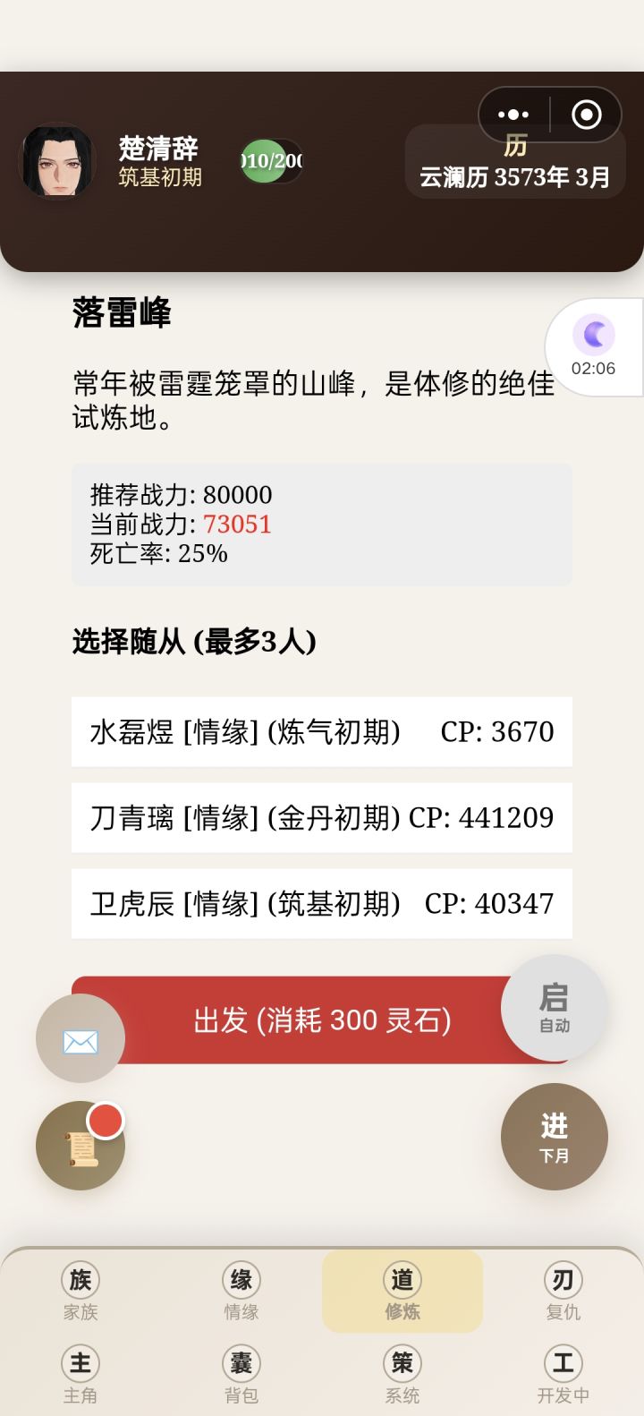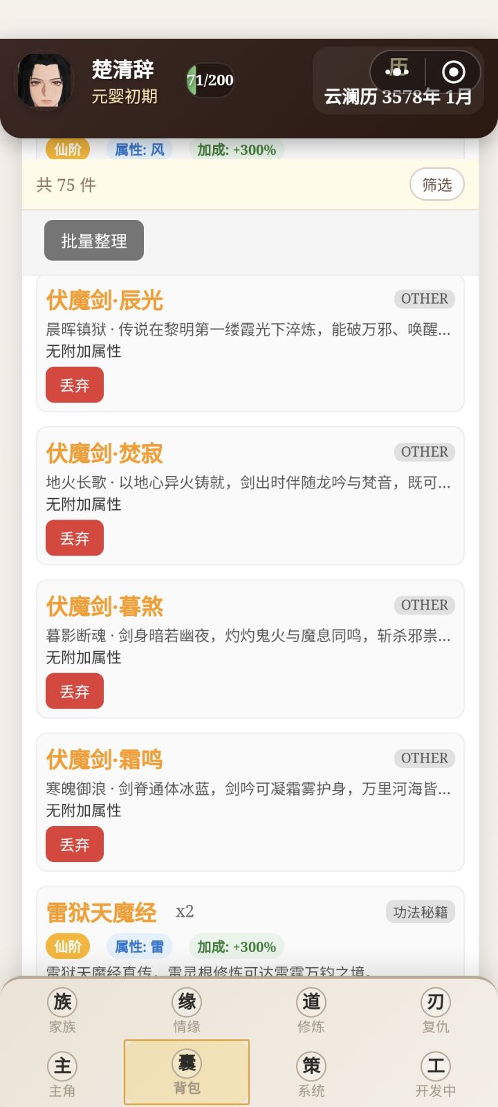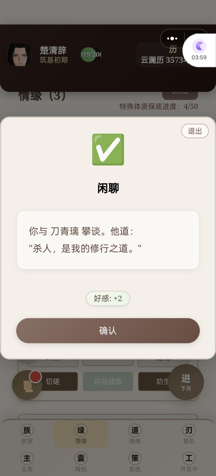 前期都让主角自己刷副本修炼,到化神期有点乏力了,准备重心转到养孩子通过反哺提升修为。我把这个游戏分为三个阶段:16-18岁——18岁-30岁(第一个孩子12岁之前)——孩子普遍12岁之后。我目前还在第二阶段,会讲一下怎样更好度过前期,在第三阶段获得最好的开局。剩下的放评论区