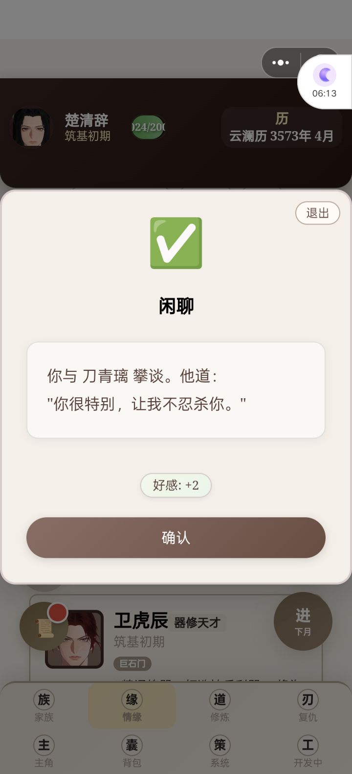 我之前还疑惑为啥怀了那么久,孩子就是生不下来,直到我读档后再去看家族那的时候,发现孕期自动归零了还有那个道侣,我已经有道侣了,但是读档后,那个主角那道侣显示没有,可是在侠缘那又有道侣