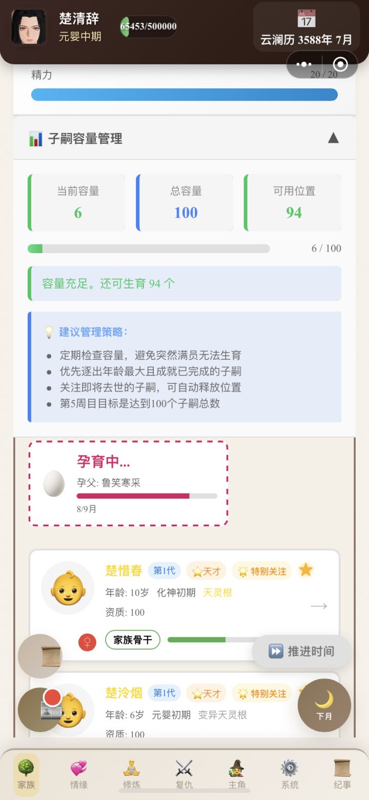 女孩得好好培养,要不停下本刷丹药堆数值,周岁刷词条,拍卖会sl 稀有体质丹,刷到手酸,男孩就无所谓了,随便养养,没那么大期待。