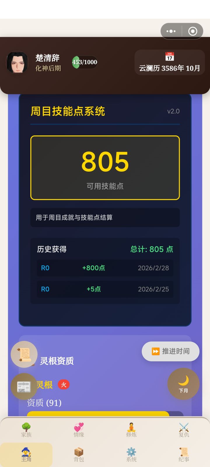 好消息 打通了坏消息 好像跟主流玩法不太一样?野蛮生长的玩了一下 没看攻略啥的(主要也没啥攻略 乐 总之是把老头打死了 满意点头知道这是个周目游戏 但总是觉得二周目就不是“我”了 所以就想着用一周目打通了结局 结果没想到是可以选本人轮回的 不过不死的话 好像轮回也没有什么意义?加上没太玩明白养娃系统 有点好资源全堆自己身上了 玩到都快打通了+升修为太吃力了 才突然想起来反哺