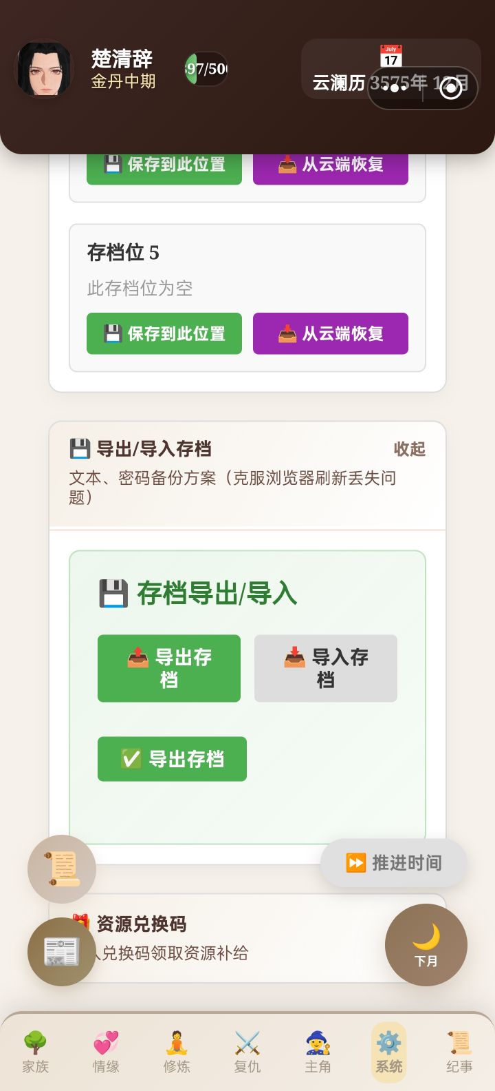 大致看了一下重点❗P1图存档导出入可以文件方式和剪切板粘贴,把剪切的存档,在粘贴读取这个时候会获得(10w灵石)❗背包🎒里的东西将会被清空❌(P2~P3图,我亲测了三次,建议先用完背包的修为丹,洗髓,分配装备,在另一个存档,确保导进存档覆盖修为进度有效。我觉得🤔如果不需要10w灵石可以不用这么弄,就弄着旧存档玩。(反正我没钱我弄我弄🙋🏻♀️)毕竟(版本更新)有了⭐精力20/20🚫P4