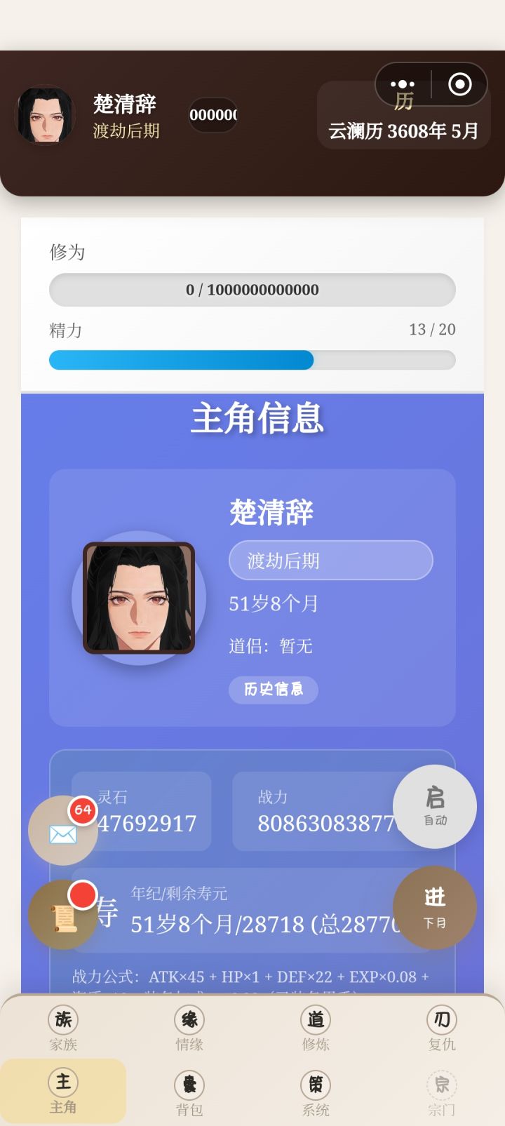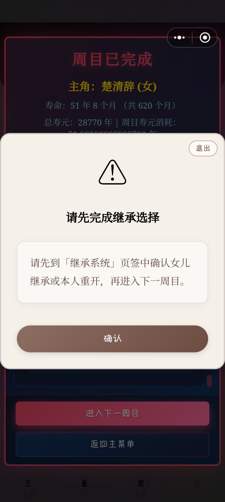 我没有看到继承页面,家书也不能一键删除,还有我觉得这一百个孩子名额应该仅限于楚星辞名下,二代不应该占用名额,要是再出个改名卡就好了……佛修满好感,游戏里过了三年还是没有还俗状态,点了好几次也没点动,我已经彻底放弃了