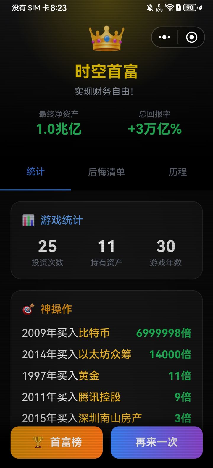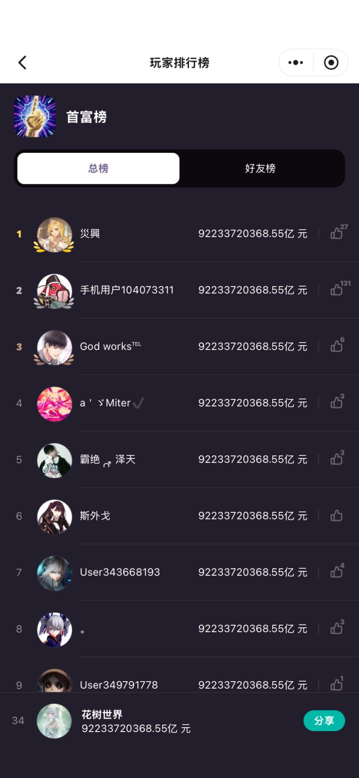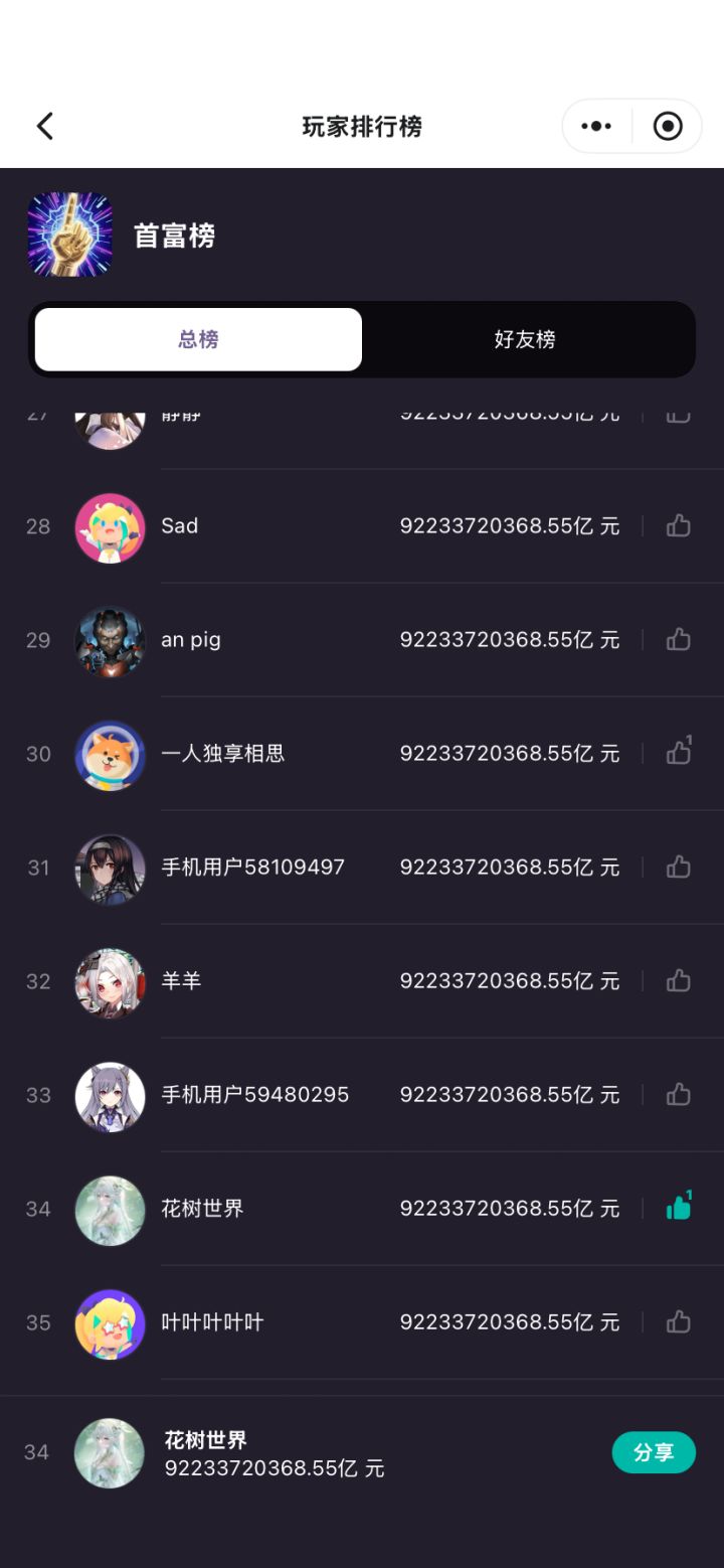 第一次玩己经到极限了,现在在玩最差的都200京亿起步,排行榜已到上限了