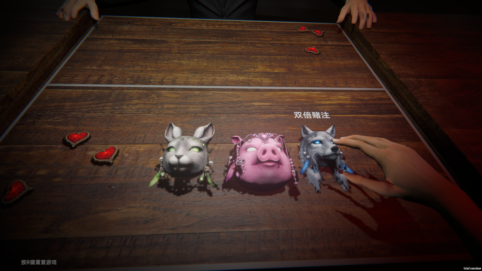 一进入游戏的画面就是3d画面,鼠标控制着右手进行操作,主界面的开赌按钮按下之后就会正式进入到游戏中,整个切换很丝滑,很有沉浸感,是非常不错的一种设计,避免了复杂的菜单功能,可以将时间更多的放在到其他内容上。游戏的画面方面的设计还是蛮和谐的,整体比较浑然一体,面具和红心的建模也蛮精致漂亮的不知道是使用的素材还是自己制作的,无论是哪种,制作人的审美都很不错。面具主题与游戏的组合也有一定的小巧思,最后的反转与前期铺垫统一,还是蛮不错的。