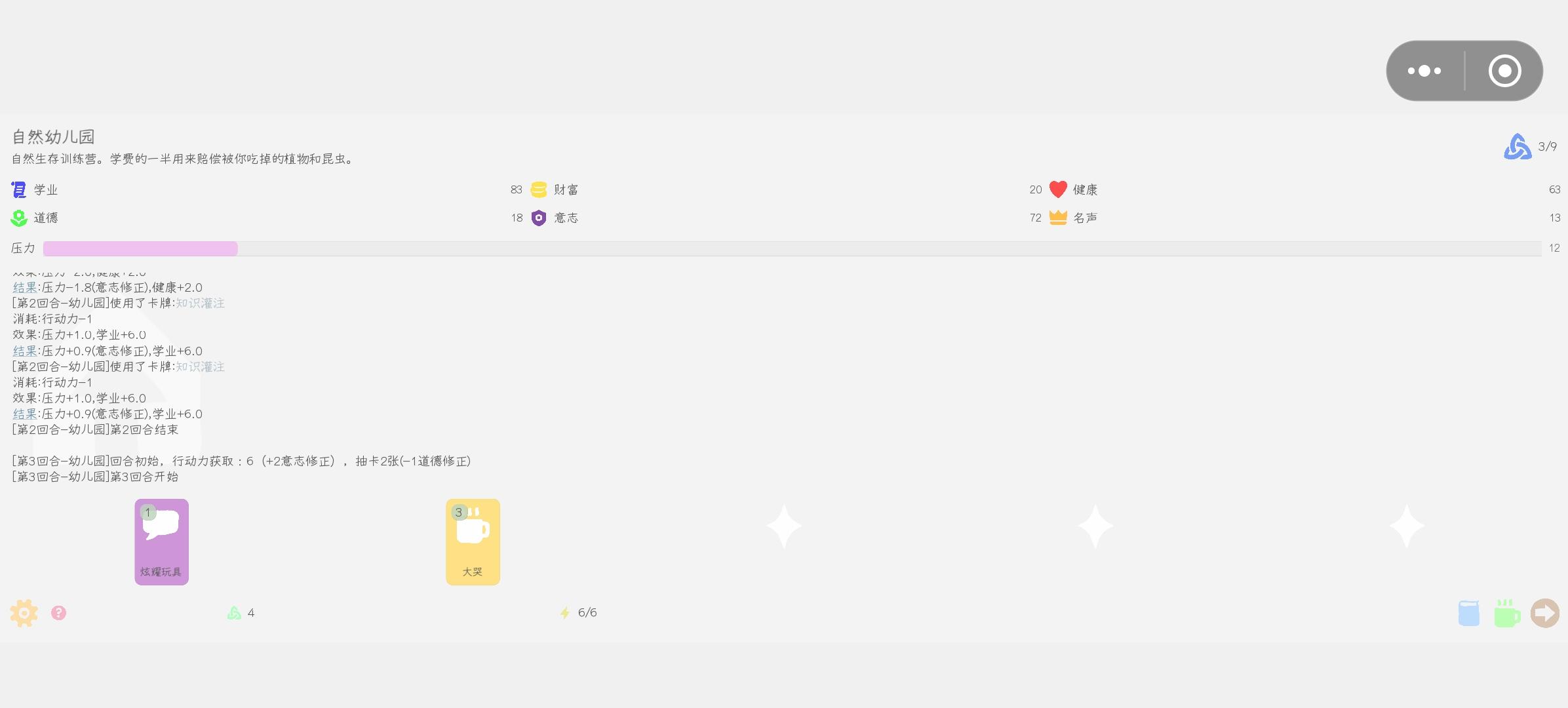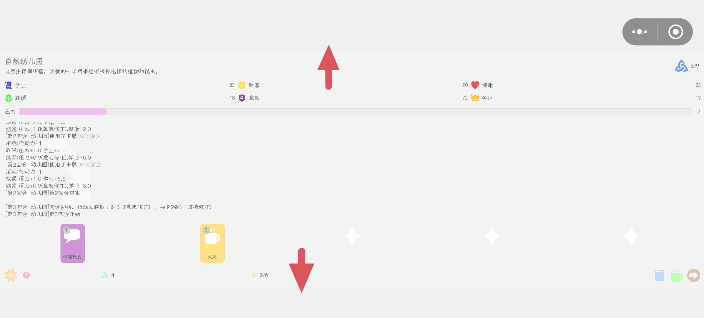 感受最深的两个点,一是很容易卡死,过回合有极大概率卡住,需要选择重新开始-继续回合,还有小概率卡死,需要退出游戏重启。二是UI设计问题,没有对手机屏幕做出适应啊,有的叉号放在很角落里,只漏出了半个,还被TapTap的返回主页的虚拟按键挡住了,虚拟按键普遍偏小。真的游戏体验被破坏了很多啊,第一把1300没上大学,每回合都要点重新开始来继续进行游戏。