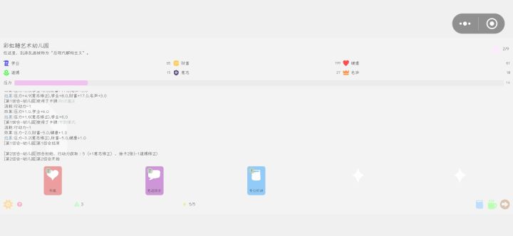很多文字,很多选项,界面简单舒服,看得出来作者很用心!可玩性一般,总共就三种开局,结局没有探索完,与市面上其他的模拟游戏不太一样。确实是一生焦虑的东亚人吧,不管是游戏的引导,还是不自觉地奋力,每次都选猛猛提高学业的选项,最大化利用卡牌。游戏不难,玩起来没有压力,基本上都可以进好学校,思想压力大,内容是升学。总之,还是不错的小游戏,很简单,或许玩完就卸载,只要不接广告,保持初心,还是很有意义