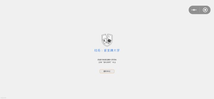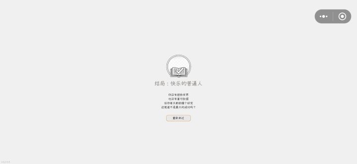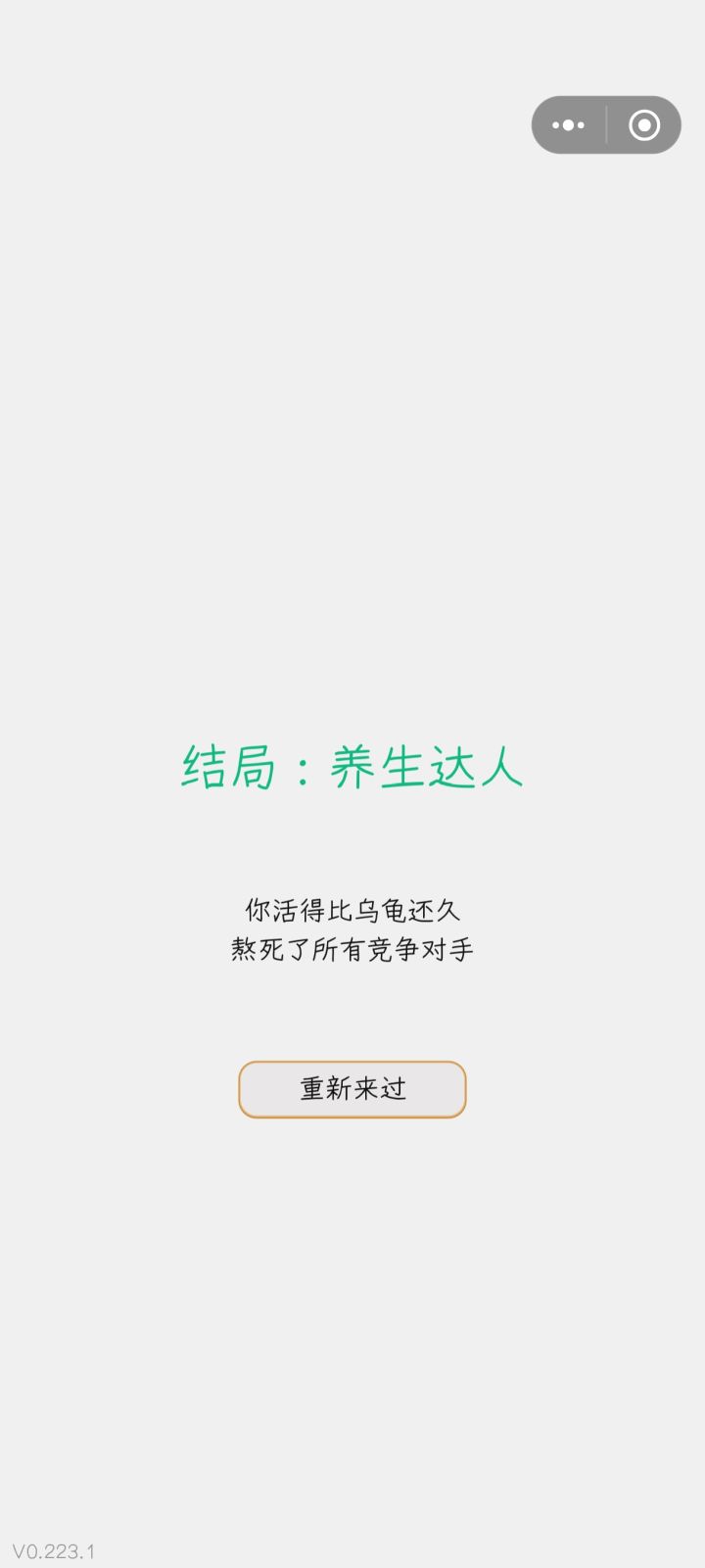 佛系青年:连续3回合保持压力值为0圣人在世:道德值≥80点中庸之道:同时满足以下条件:健康值≥60点,压力值≤40点,意志值≥60点,道德值≥60点,名声值≥60点水桶成精:同时满足以下条件:健康值≥90点,压力值≤10点,意志值≥90点,道德值≥60点,名声值≥90点丐帮帮主:触发结局"丐帮帮主",条件:财富值≤-200我是谁?:触发结局"我是谁?",触发条件:意志值≤0负翁:触发结局"负翁",触发条件:连续3回合财富值<0ICU常驻嘉宾:触发结局"ICU常驻嘉宾",同时满足以下条件:健康值≤0,压力值<70强制关机:触发结局"强制关机",同时满足以下条件:健康值≤0,压力值≥70少年管教:触发结局"少年管教",同时满足以下条件:高中及以下,道德值≤0铁窗泪:触发结局"铁窗泪",同时满足以下条件:大学及以上,道德值≤0社死名场面:触发结局"社死名场面",同时满足以下条件:高中及以上,名声值≤0过街老鼠:触发结局"过街老鼠",同时满足以下条件:道德值≤5,名声值≤5印钞机转世:触发结局"钞能力者",同时满足以下条件:财富值≥24000,名声值≥90