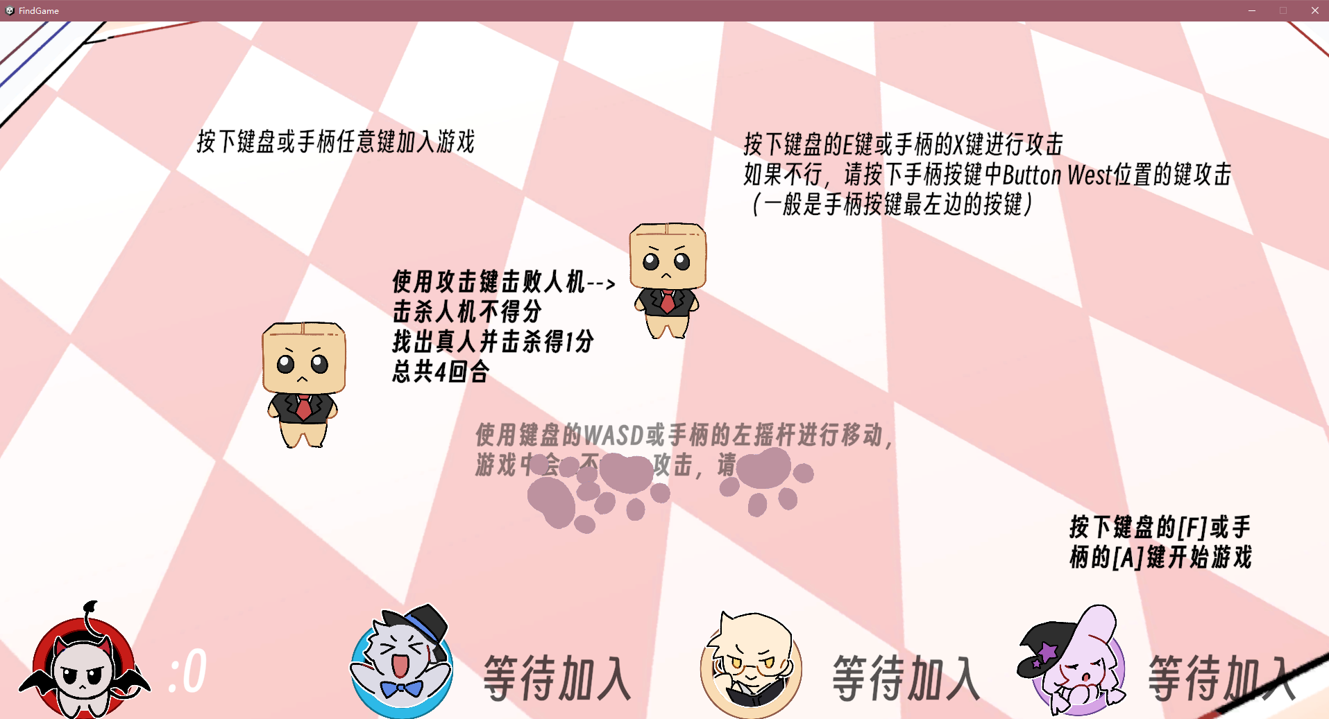 由雨声工作室在Global Game Jam 2026制作的本地联机休闲游戏《Find》,游戏规则简单易懂,玩家在游戏中控制自己的方块头小人,在躲避从天而降的猫猫拍抓的同时,从一大堆的方块头小人中找到其他玩家控制的方块头小人并将其击败,于4个回合中获得分数最高者为胜者。