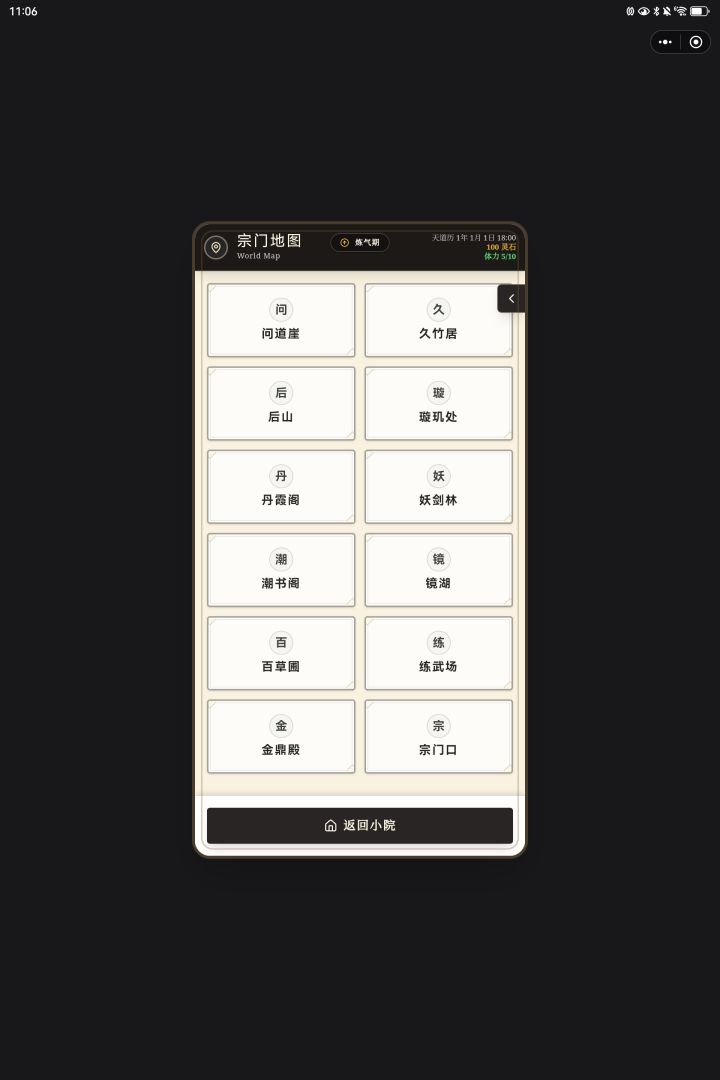 1.基本1.1 关于境界筑基期 500修为金丹期 1000修为元婴期 5000修为化虚期 10000修为炼虚期 50000 修为合体期 100000(10w)修为大乘期 500000(50w)修为飞升(渡劫期) 1000000(100w)修为(不知道为什么飞升之后的界面是「逐出宗门」,疑似bug)1.2 关于战斗血量=气血=修为攻击力疑似有bug,我好几个档无论修为多高、