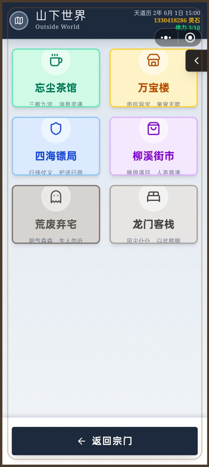 1.基本1.1 关于境界筑基期 500修为金丹期 1000修为元婴期 5000修为化虚期 10000修为炼虚期 50000 修为合体期 100000(10w)修为大乘期 500000(50w)修为飞升(渡劫期) 1000000(100w)修为(不知道为什么飞升之后的界面是「逐出宗门」,疑似bug)1.2 关于战斗血量=气血=修为攻击力疑似有bug,我好几个档无论修为多高、