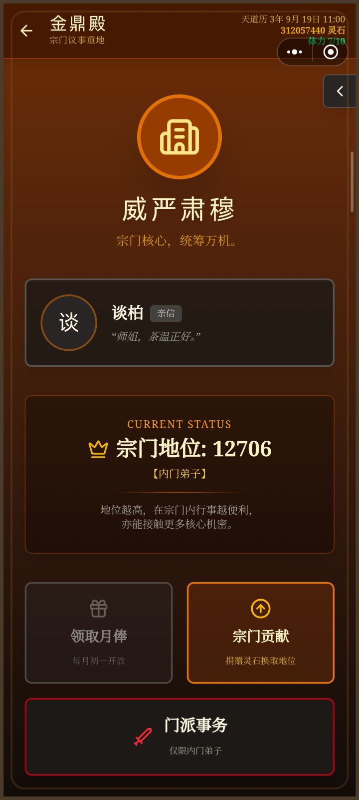 谈柏的两年之约后升级为长老,收弟子解锁,功德比较难攒,我用丹药把自己修为提了一下亲自教弟子,否则太难熬了。两年之约速通大法⑴准备工作捐赠灵石到700地位以上,进入内门,每月灵石100→500⑵①前三个月主要攒灵气、物资加招募弟子,灵石自掏腰包垫上,页面拉到最下可以看到空闲弟子人数,招募人数可以反复SL(save/load),尽量取整数,前三个月可以视情况开“演武操练”②三个月之后再进门派