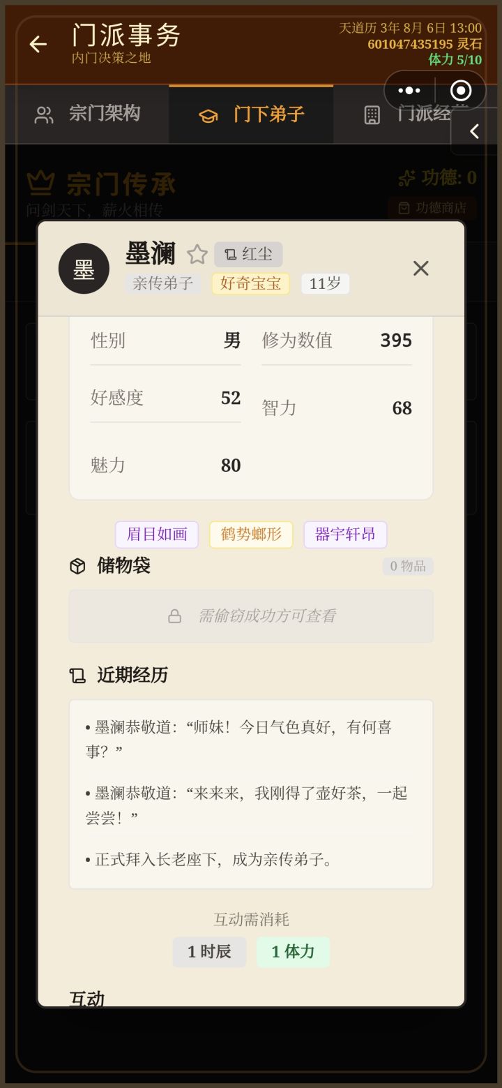 1.基本1.1 关于境界筑基期 500修为金丹期 1000修为元婴期 5000修为化虚期 10000修为炼虚期 50000 修为合体期 100000(10w)修为大乘期 500000(50w)修为飞升(渡劫期) 1000000(100w)修为(不知道为什么飞升之后的界面是「逐出宗门」,疑似bug)1.2 关于战斗血量=气血=修为攻击力疑似有bug,我好几个档无论修为多高、