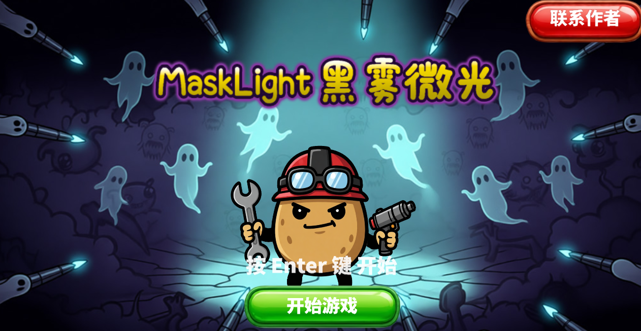 《黑雾微光》非也,我觉得在起名上用《是土豆就战30秒更好》,游戏本质上是一款躲避球游戏,游戏中玩家需要操控土豆主角躲避来自四面八方的子弹攻击,一共有三滴血,打中扣一血,全部扣完游戏结束,在新一关开启的时候会刷新血量。游戏的场景为长方形,全场都覆盖有迷雾,只有主角土豆的周围有一圈光亮能提供有限的视野,确实有点黑雾微光的感觉。本次大赛的主题是mask,作者在简介中阐述的是面具般黑雾,似乎有点牵强。