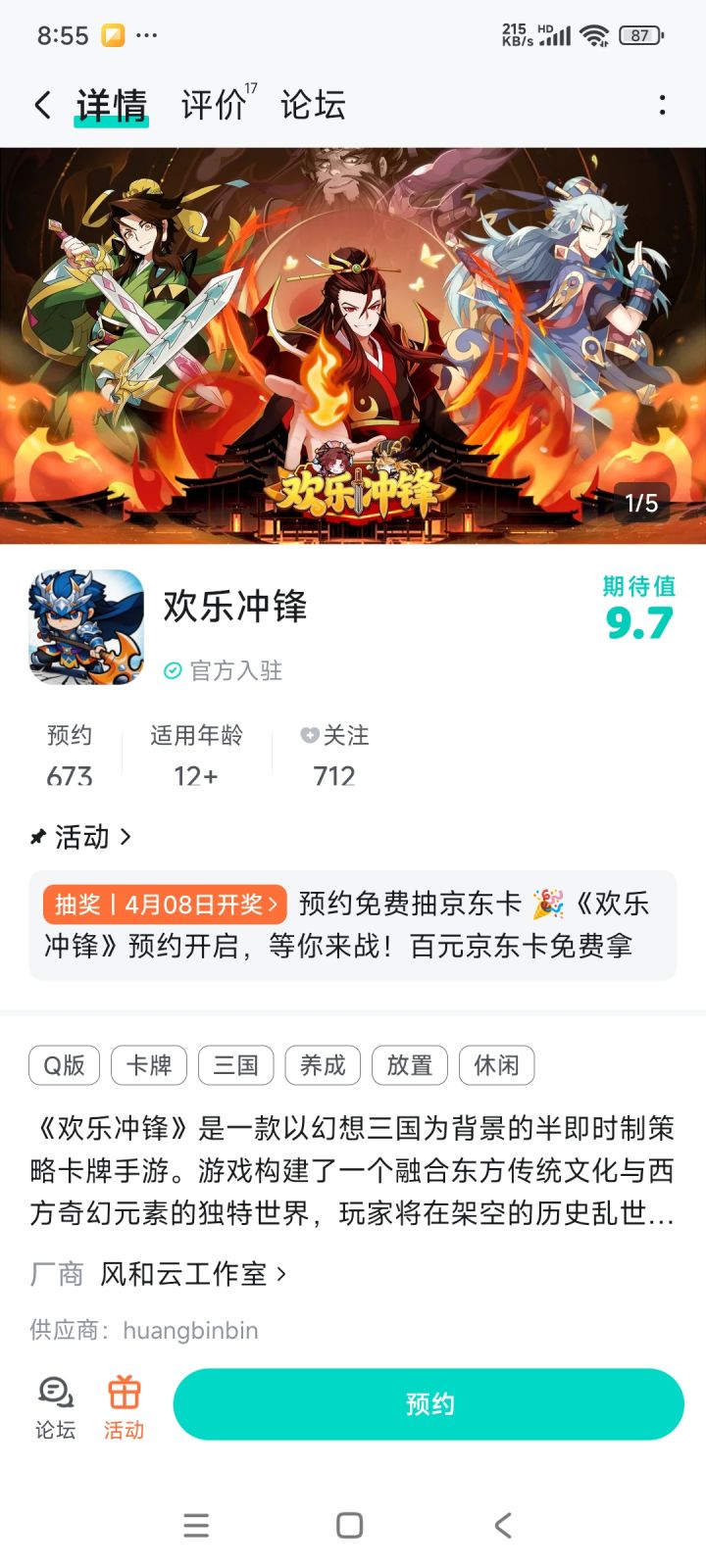 亲爱的主公们:《欢乐冲锋》即将开启首次测试!这是一款主打幻想三国 + 半即时策略的卡牌手游,无论你是三国爱好者、策略搭配大神,还是养成收集玩家,都能在这片东方三国与西方奇幻交织的魔幻世界中,找到属于你的征战节奏!📌现在预约游戏,即可参与抽奖活动!我们准备了实打实的福利送给各位提前入驻的主公!🎁【预约福利抽奖内容】🏆一等奖(1 位):100 元京东卡🥈二等奖(1 位):50 元京东卡🔥