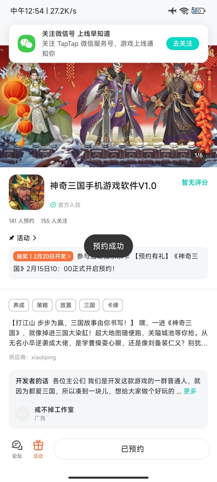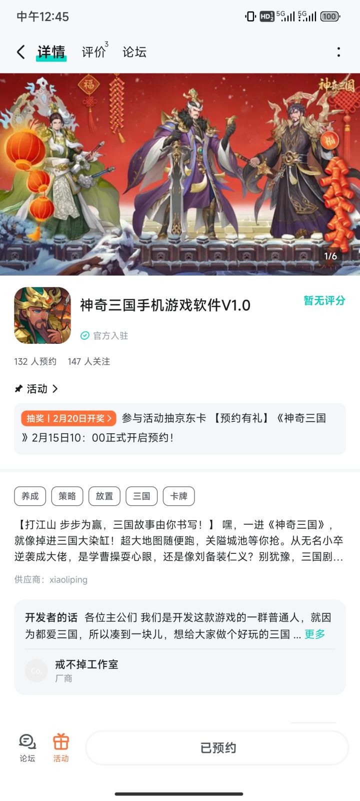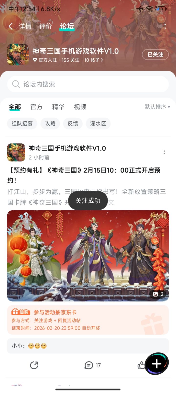 打江山,步步为赢,三国故事由你书写!全新放置策略三国卡牌《神奇三国》开放预约~>>>点击即可预约【参与方式】1.关注《神奇三国》且发新帖晒截图2.在本帖下方评论区分享发帖链接即可【活动时间】即日起~2026年2月20日 23:59【活动奖励】京东卡,共5份【注意事项】1.仅有符合活动要求的评论会被视为有效参与活动,若回复内容未能满足活动要求,则被视为无效回复,取消获奖资格。2