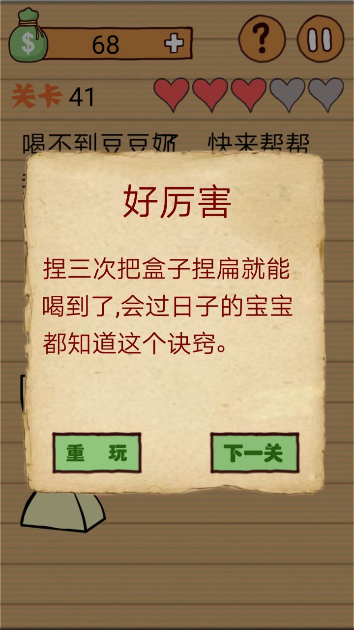 玩这个还可以,就是有些关卡有点无聊。。。整题还不错。我看见有人更到40,我就继续往下更【主要是我懒】41关,两个手指挤盒子,挤三次。题目那个豆豆奶是没用的。42.往左六次43.44.45.先把微信放在"收银台”字那,然后是支付46.选择一个数,然后晃手机,嗯。。。剩下的全靠运气【我就是一直选一个。。。剩下最后一颗心 ,就结束游戏,再开始游戏】47.葡萄→草莓→山竹→梨→菠萝→西瓜4