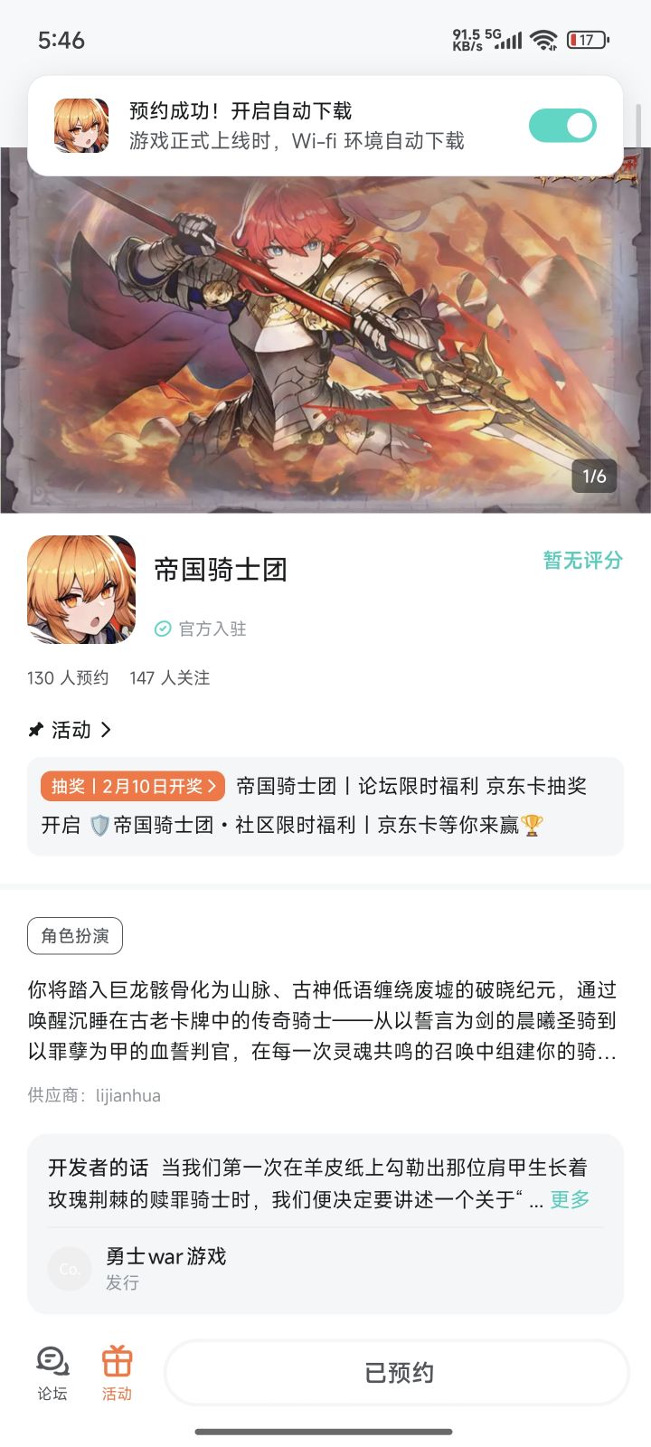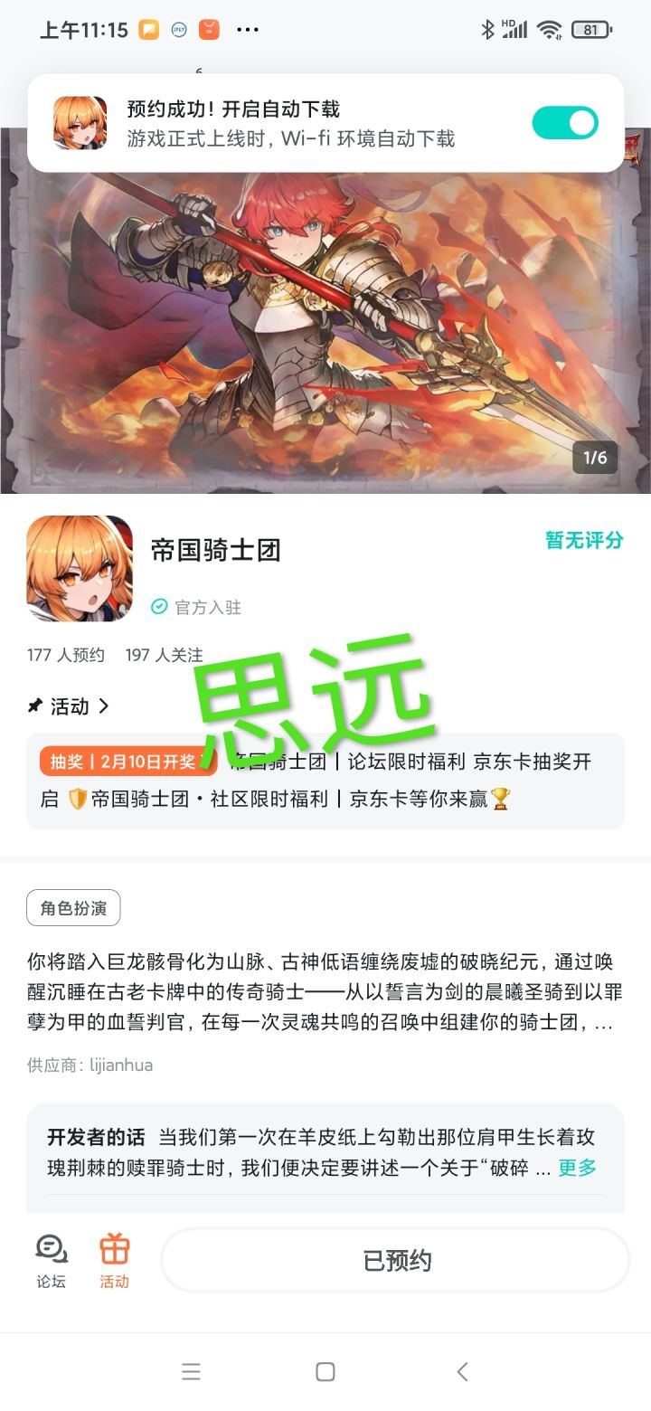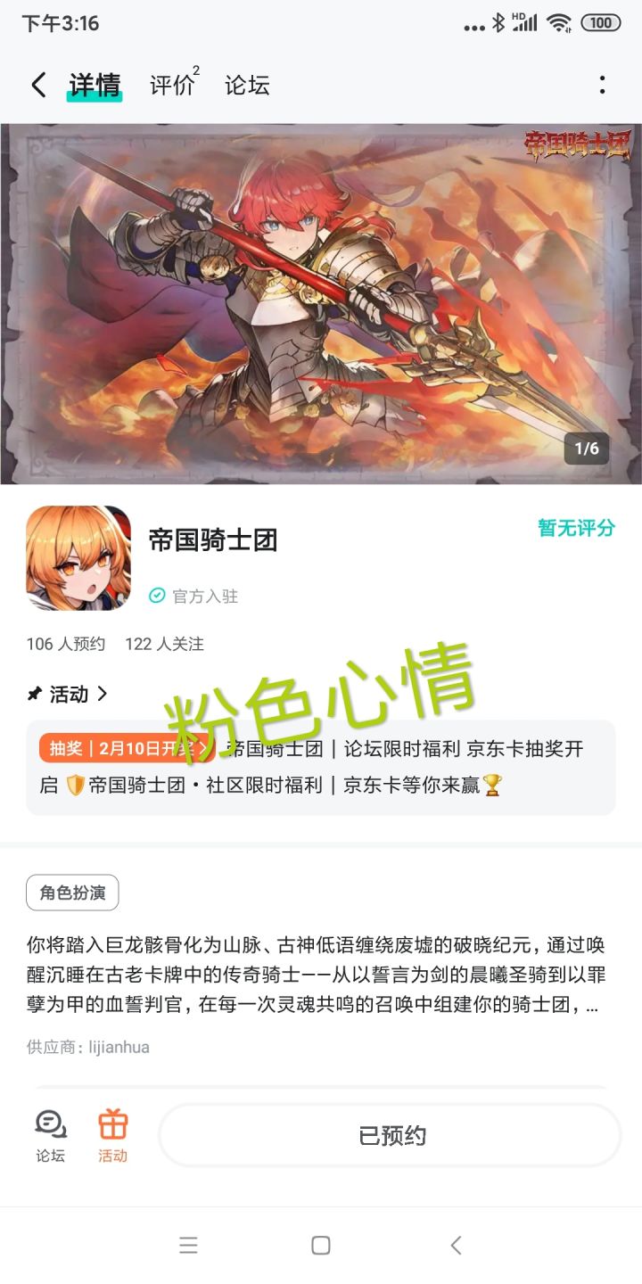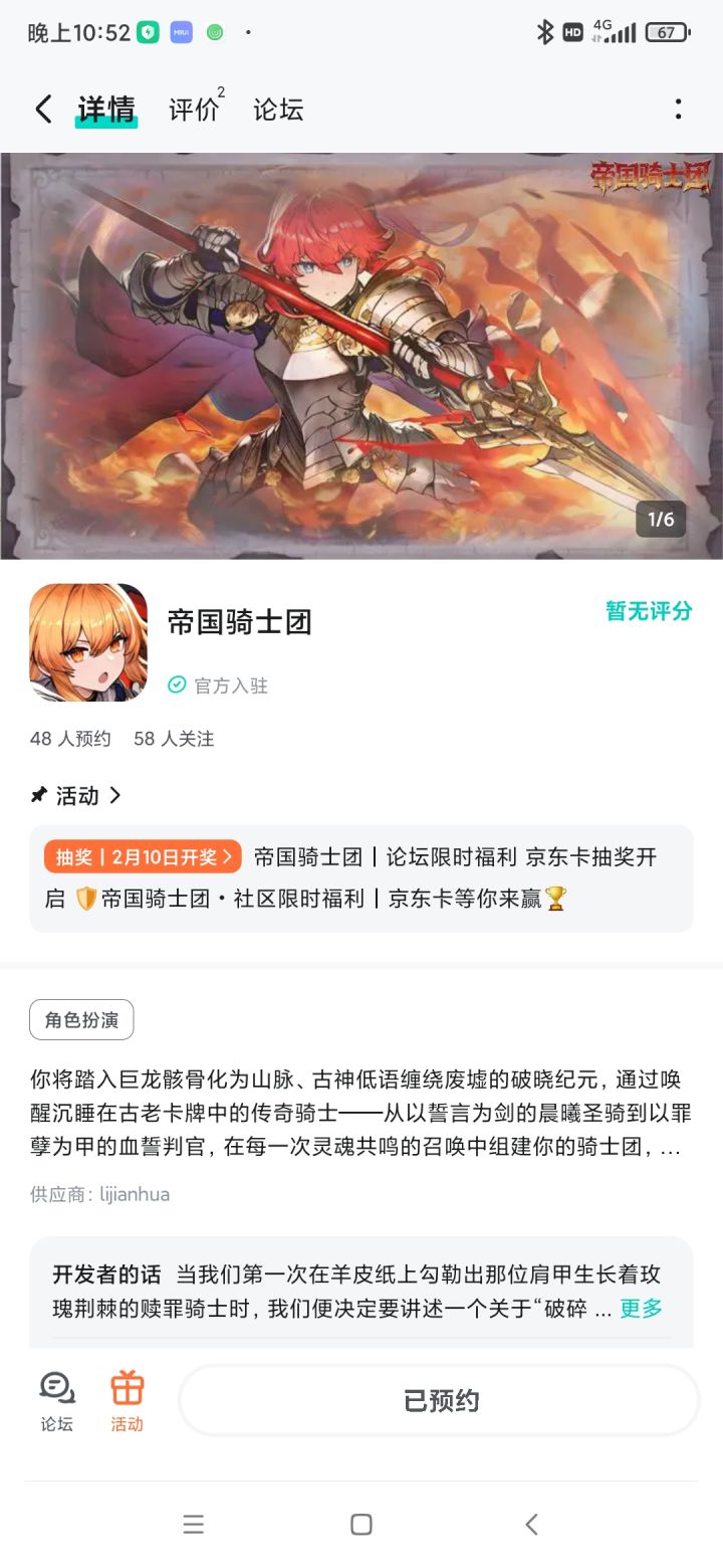 踏入巨龙骸骨成脉、古神低语萦废墟的破晓纪元!唤醒晨曦圣骑、血誓判官等传奇骑士卡牌,以灵魂共鸣组建专属骑士团,驭飞马破永夜、执鸢尾盾抗深渊,收复圣城、破解诅咒秘仪,于荣光与黑暗间书写骑士史诗✨社区专属限时活动开启,京东卡福利免费抽,骑士们速来集结!🎁活动奖励抽取1 位幸运玩家,赠送京东卡×1📝参与方式1.点击预约《帝国骑士团》并发新帖晒截图2.在本帖下方评论区分享发帖链接即可⏰奖品发