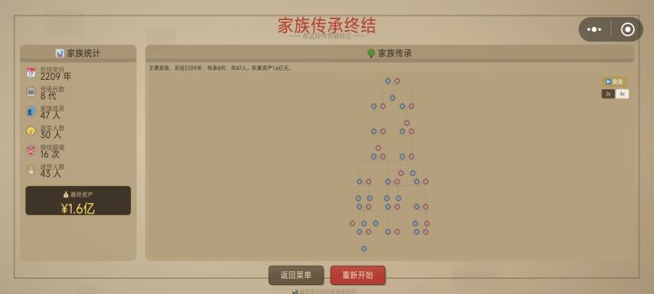 虽然画风简约,但是不会让人感觉是半成品。自由模式下发现可以自动跳过简直惊了,就是有以下问题,首先是选项太少了,然后事件也就是那几个。另外开启自动模式后会有bug,死过的人还能继续出现事件。因为家族总是不能开枝散叶,不知道为什么,死的有点太早了。然后出轨离婚后不会展开为新的家庭