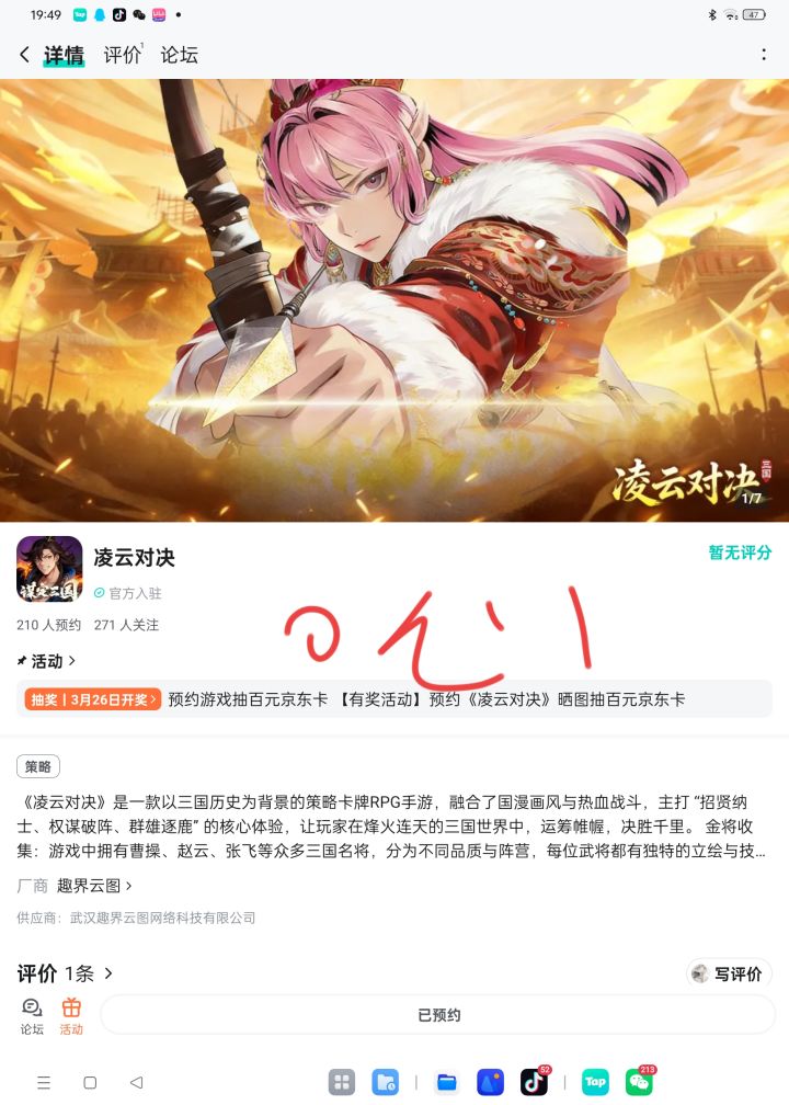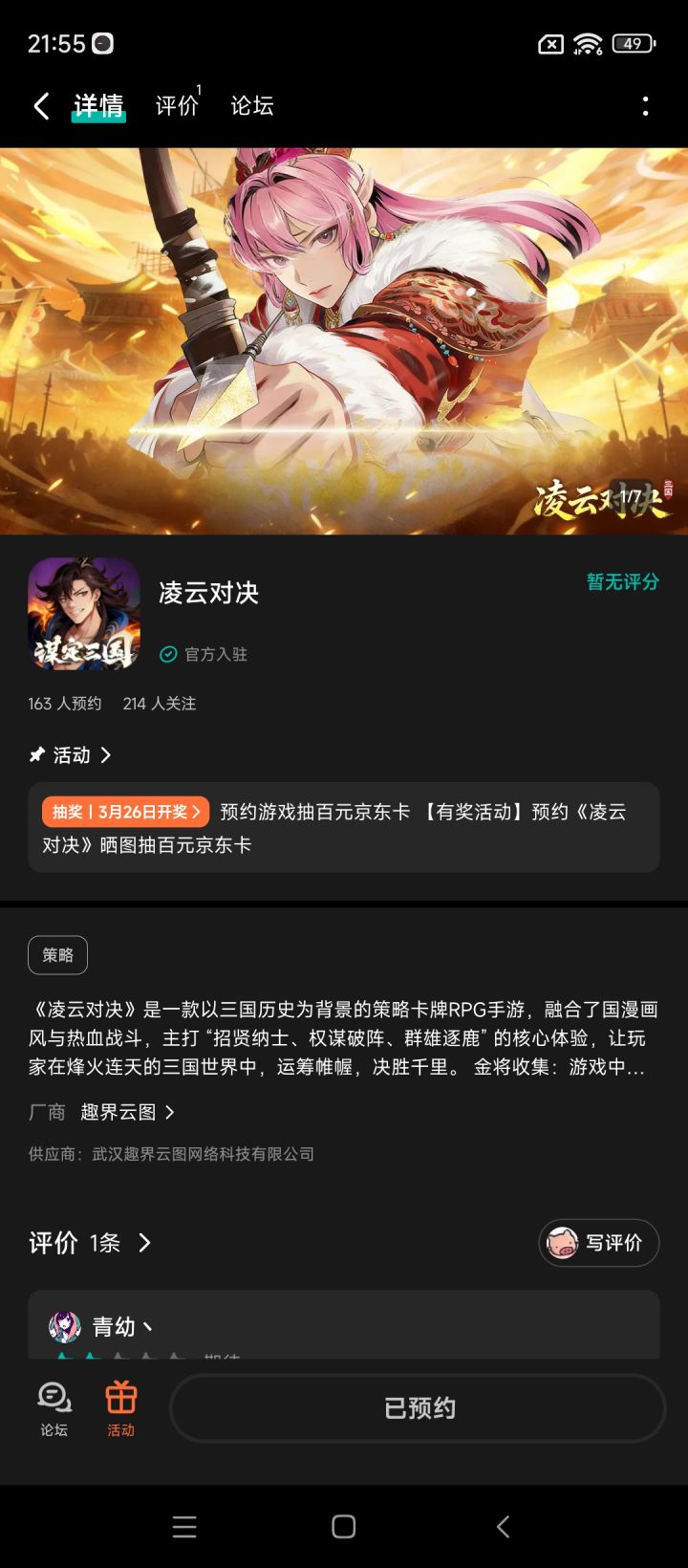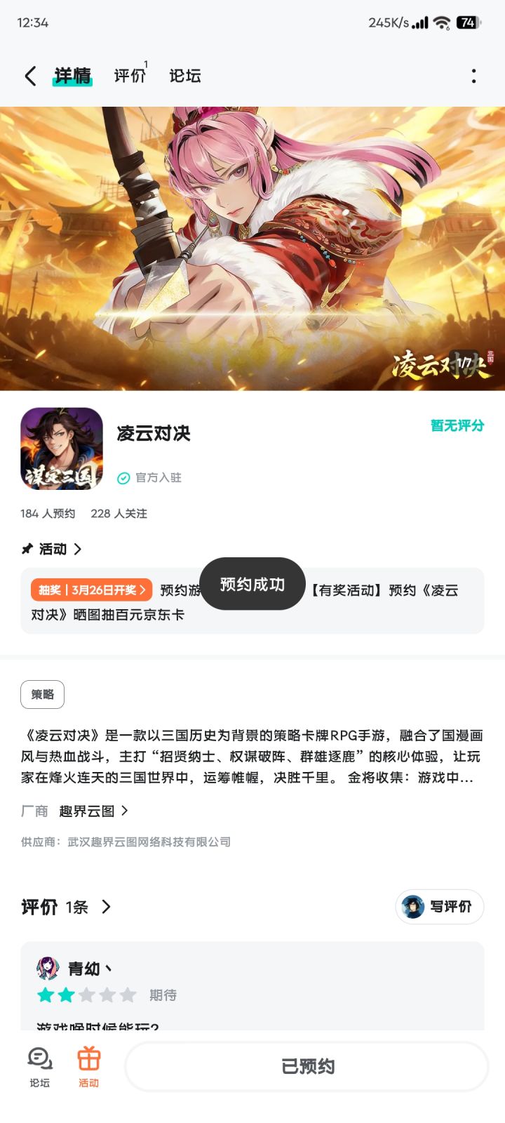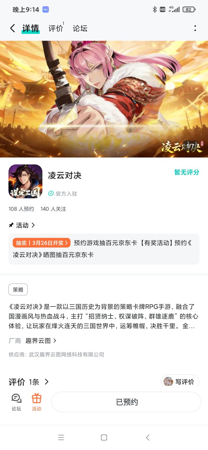 论坛专属活动已启,速来参与赢福利!三国乱世由你改写,成王败寇一念之间。轻松上手深度策略,休闲与硬核兼顾。【参与方式】1.点击关注预约游戏并发新帖晒截图2.在本帖下方评论区分享发帖链接即可【活动时间】即日起至2月5日【活动奖励】随机抽取1名符合参与条件的玩家获得:100元京东卡一张【活动规则】1.内容禁止涉及暴力、色情、政治、恐怖内容,违者做删帖处理并取消活动资格;2.回复内