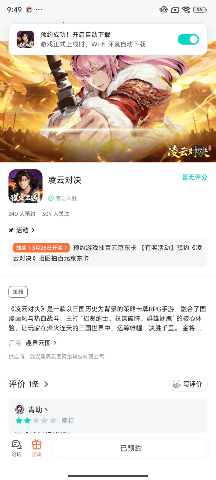 论坛专属活动已启,速来参与赢福利!三国乱世由你改写,成王败寇一念之间。轻松上手深度策略,休闲与硬核兼顾。【参与方式】1.点击关注预约游戏并发新帖晒截图2.在本帖下方评论区分享发帖链接即可【活动时间】即日起至2月5日【活动奖励】随机抽取1名符合参与条件的玩家获得:100元京东卡一张【活动规则】1.内容禁止涉及暴力、色情、政治、恐怖内容,违者做删帖处理并取消活动资格;2.回复内