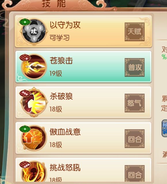 一、点击右下角“更多”按钮,可以打开技能系统二、主角技能主要分怒气技能、回合技能、被动技能、、天赋技能、普通技能三、角色等级提升,然后效果部分铜币就可以提升技能等级,每个技能都有秘诀,提升秘诀等级可以给技能带来额外的效果,秘诀升级需要奥义卷轴四、技能系统还包含修炼技能、生活技能、其他技能修炼技能可以提升名将和角色属性;生活技能可以获得日常任务材料;伴侣技能,增加被动技能,概率复活伴侣等