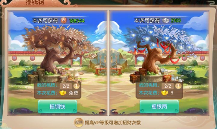 一、点击左下角“摇钱树”按钮,可以打开摇钱树界面;摇钱树活动玩家可以通过花费元宝购买铜币或者是银币;普通玩家每天只有2次机会,提高VIP等级可以增加招财次数;2144《水煮三国》运营团队