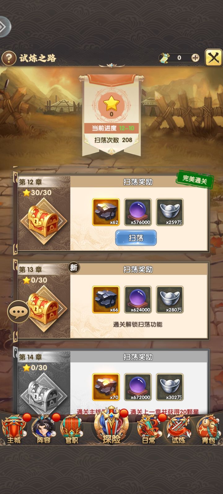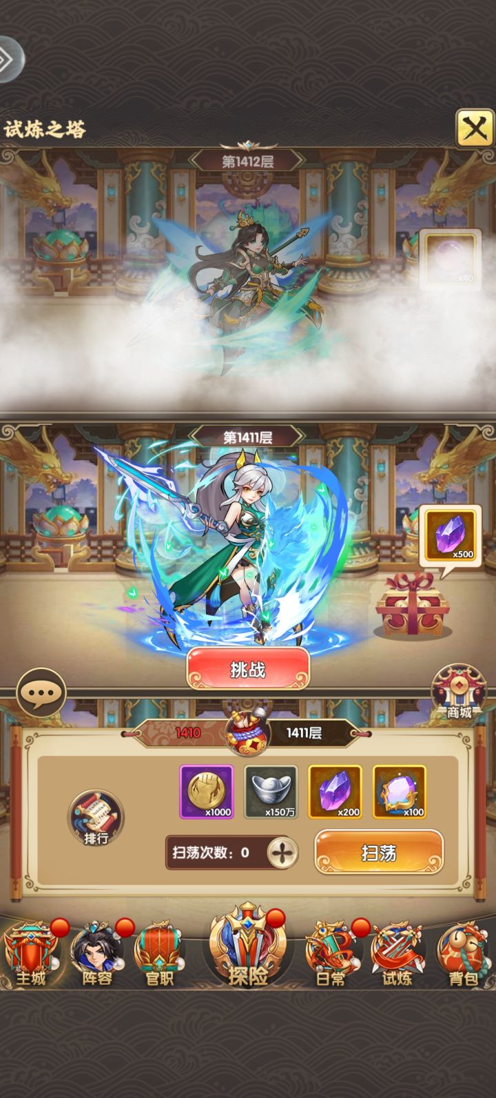 试炼塔止步1411层,试炼路完美通关第12章。短时间内提升不动了,养老,打到这个进度多亏了刘备,但是下一步,迫切需要养个红4星司马懿,否则后面啥也打不动。实际体验下来,马超伤害完全碾压神孙策,刘备回血跟华佗五五开,黄月英勉强算是半个诸葛亮,但是司马懿真没法替代……必养!再过2个月,刘备神兵觉醒到3星,普通郭嘉可以淘汰了,换神司马懿破减伤,可以极限第一回合先手秒一切!