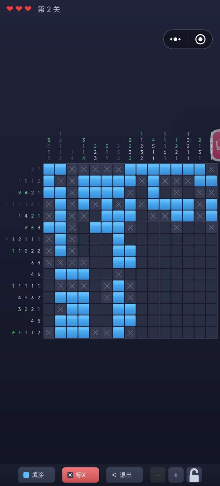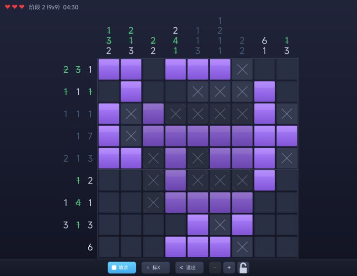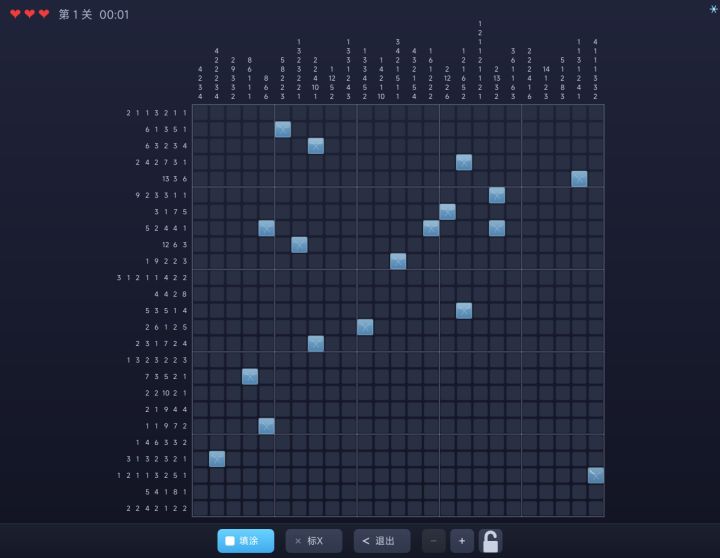 你面前是一张空白网格。左侧和上方各有一组数字提示——它们告诉你每行每列里有几个格子需要填涂、以及这些格子怎么分布。比如提示 2 3,意思是这一行有连续 2 格和连续 3 格需要涂黑,中间至少隔一格。你的武器只有逻辑推理。填对了,一幅隐藏的像素图案会浮现出来。操作只有两种:填涂(确定该涂的格子)和标 X(确定不该涂的格子)。三颗红心,每填错一格扣一颗,耗尽则游戏结束。不能靠猜——每一次落指都要有
