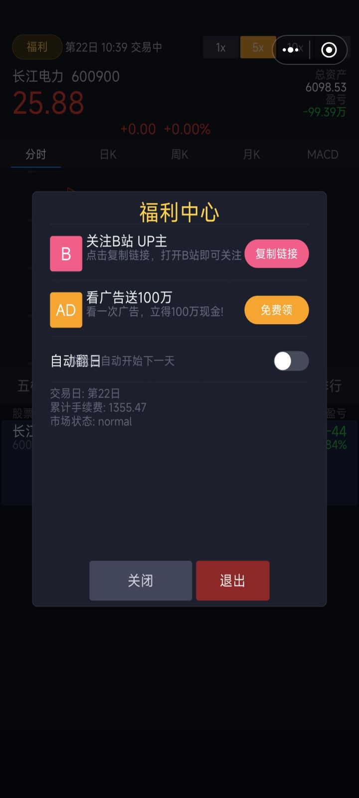 还有那个看广告送 100 万的设置,虽然能快速拿启动资金,但玩下来总觉得广告存在感有点强,甚至看到有朋友说这就是个广告模拟器,这点还是得好好平衡一下。其实这个题材真的挺好的,经济模拟类里股票交易本来就很热门,好好打磨一下完全能做得更好。比如可以多加些不同的公司股票,把现在单机的排行榜改成真正的多人在线联机玩法,再加些股票上市、分红这类更贴合真实股市的内容,把自选股放在首页,点进个股再出交易界面,操作起来也更顺手。甚至可以加点别的创新玩法,比如虚拟挖矿之类的,别跟现在市面上的同类游戏同质化太严重,还是有很多可以发挥的空间的。