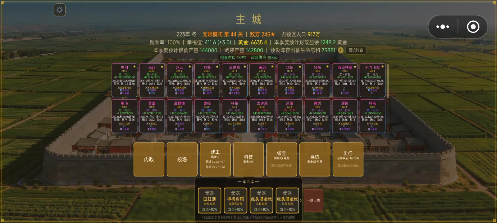 目前两个版本都已经通关。挑无线模式打到37层。省流版:424阵容。双火+控制+双奶+斩杀武将:前排一定要有刘备、关羽。中排华佗+射手(或吕蒙)。后排推荐:周瑜、诸葛、陆逊(双火+控)、司马懿(群伤)、黄忠(斩杀减员)【尽量抽蜀国的。五虎将,搭配前面阵容里的】科技:通商>识人。这游戏就是搞经济的情况下,一个劲抽武将就行。装备我们只需要10个人的,免费送的基本够用。想看详细的,请继续分为3部